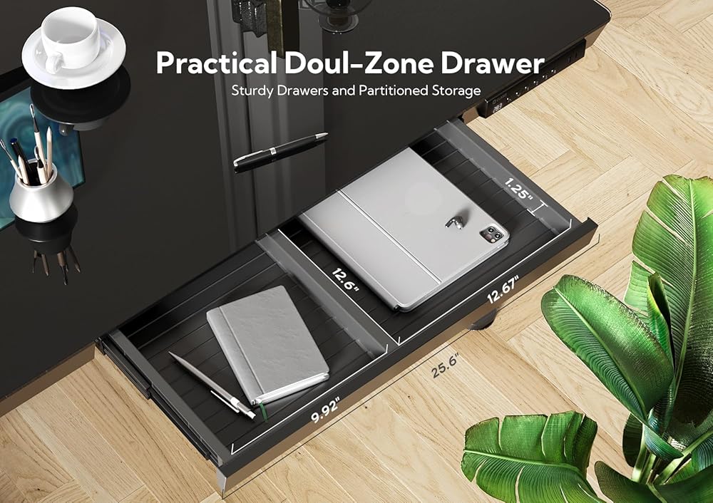 Storage Drawers: The built-in pull-out drawers provide a hidden storage solution for easy desktop organization, giving you more space and less clutter