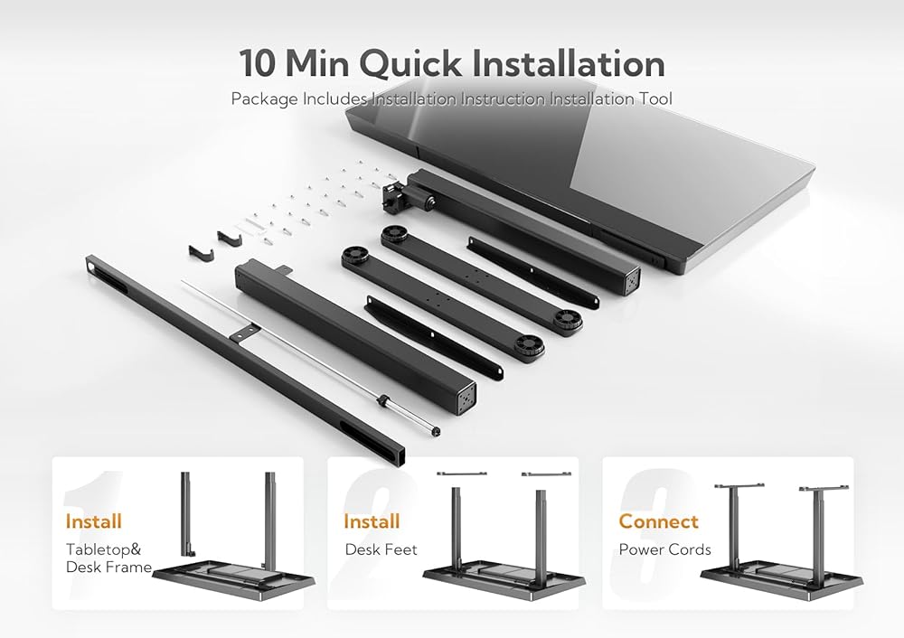 Simple Assembly: Assembling our glass standing desk is a breeze. Just attach the legs to the top, plug in the power cord, and you're good to go. The desk is capable of supporting up to 132 pounds