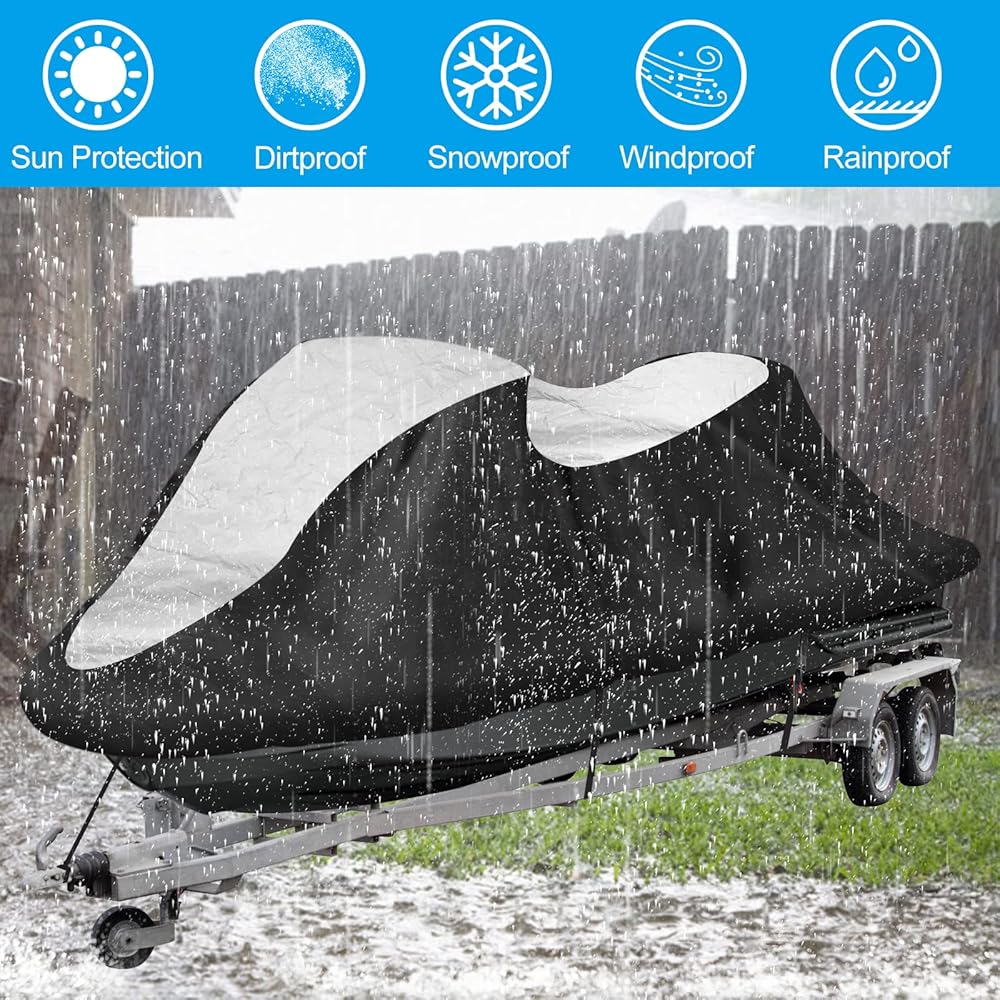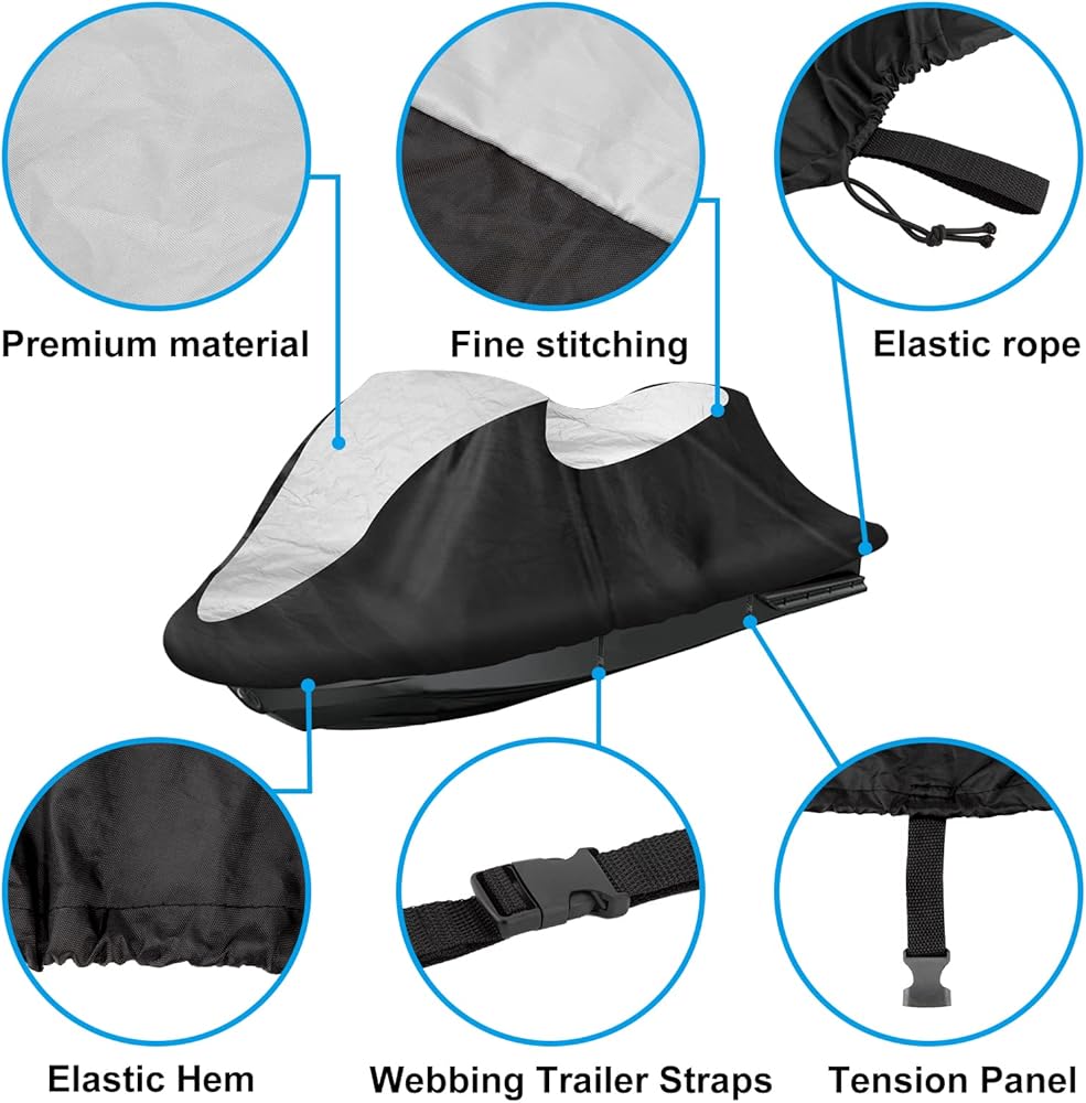 [حواف مرنة وأشرطة إبزيم]: تتميز بحبل مرن عالي التحمل مغلف في الحاشية للحفاظ على الغطاء محكمًا للتزلج النفاث. فتحة الحاشية موجودة في الجزء الخلفي من غطاء جت سكي، يمكنك ضبط إحكامه بواسطة السلك. يمكن استخدام شريطين بإبزيم لمزيد من الأمان عند تركيب جت سكي على مقطورة.