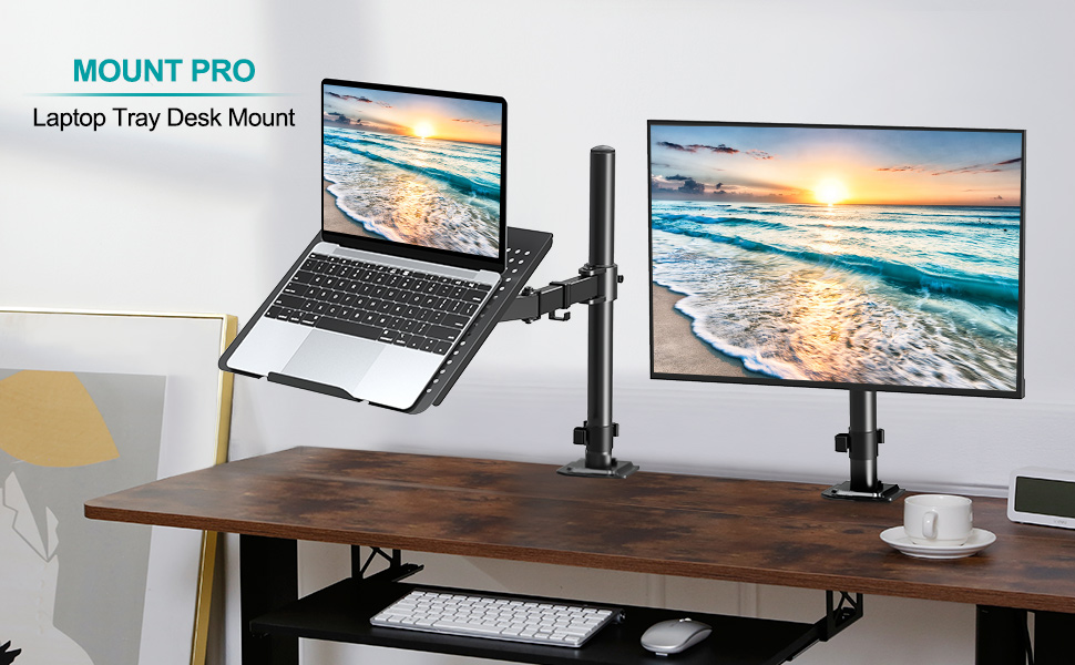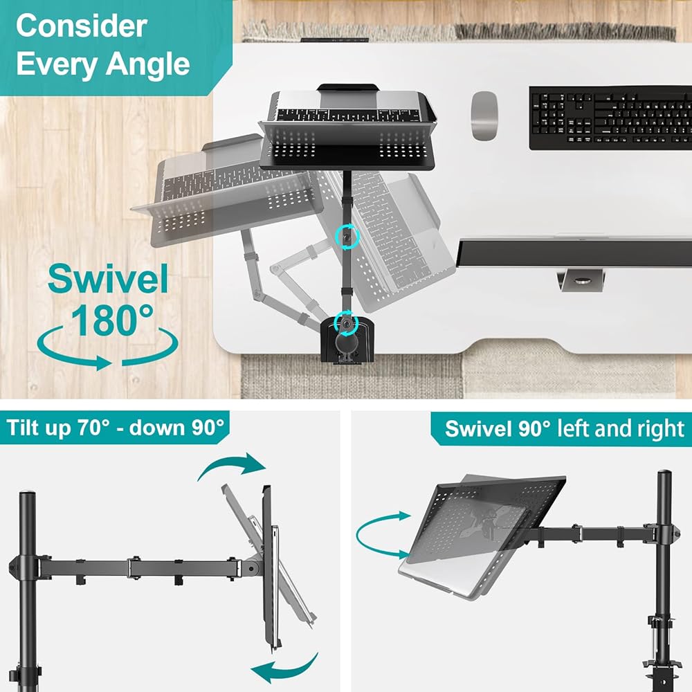 حامل كمبيوتر محمول واحد من MOUNT PRO مع صينية لأجهزة الكمبيوتر المحمول حتى 17 بوصة، ويتحمل ما يصل إلى 17.6 رطل، حامل تثبيت على مكتب الكمبيوتر المحمول/الكمبيوتر المحمول قابل للتعديل بالكامل، حامل ذراع كمبيوتر محمول عالي التحمل مع مشبك وقاعدة جروميت