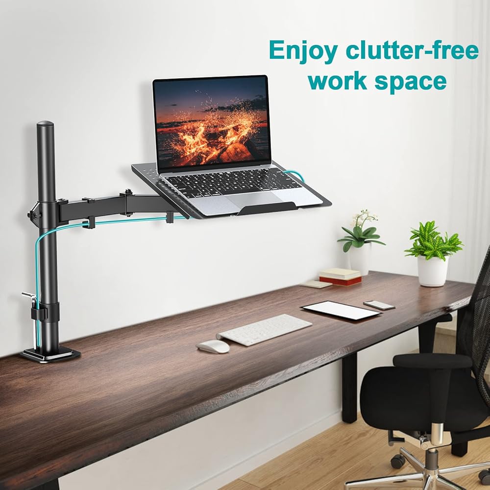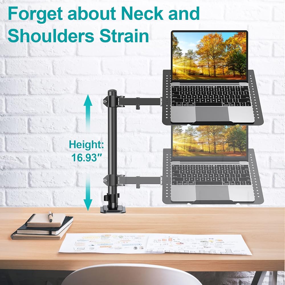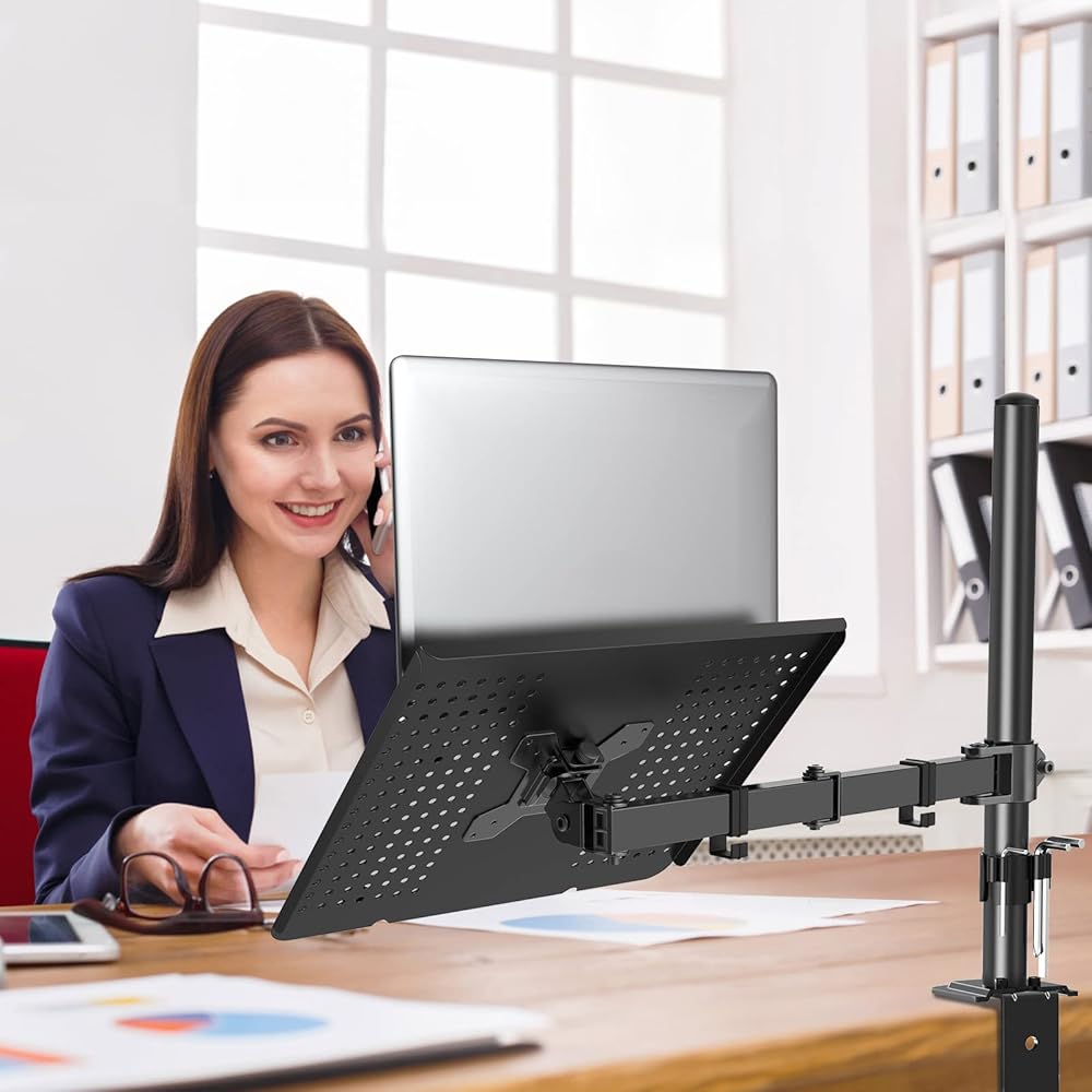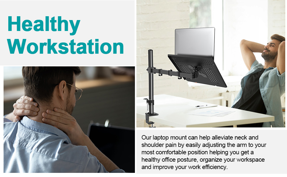 • محطة عمل صحية - ذراع تثبيت الكمبيوتر المحمول يسمح لك برفع الكمبيوتر المحمول الخاص بك من سطح مكتبك إلى ارتفاع مريح للحصول على وضع رؤية مثالي ووضعية مكتب صحية، مما يقلل الضغط على رقبتك وأكتافك، ويساعد على خلق نمط عمل صحي، وزيادة كفاءة عملك. .