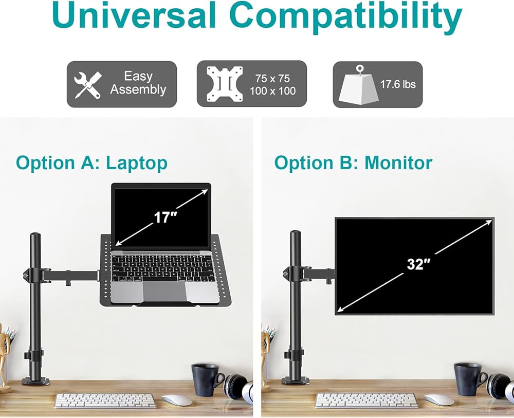 • حامل عالمي للكمبيوتر المحمول - ذراع حامل الكمبيوتر المحمول يناسب الكمبيوتر المحمول/الكمبيوتر المحمول مقاس 12 بوصة إلى 17 بوصة ويدعم وزنًا يصل إلى 17.6 رطلاً. نظرًا لأن صينية التهوية قابلة للفصل، فهي تدعم أيضًا شاشة يصل حجمها إلى 13-32 بوصة و17.6 رطلاً مع فتحات تثبيت VESA مقاس 75 × 75 مم أو 100 × 100 مم في الخلف. يمكنك التبديل بين الكمبيوتر المحمول والشاشات حسب الرغبة.