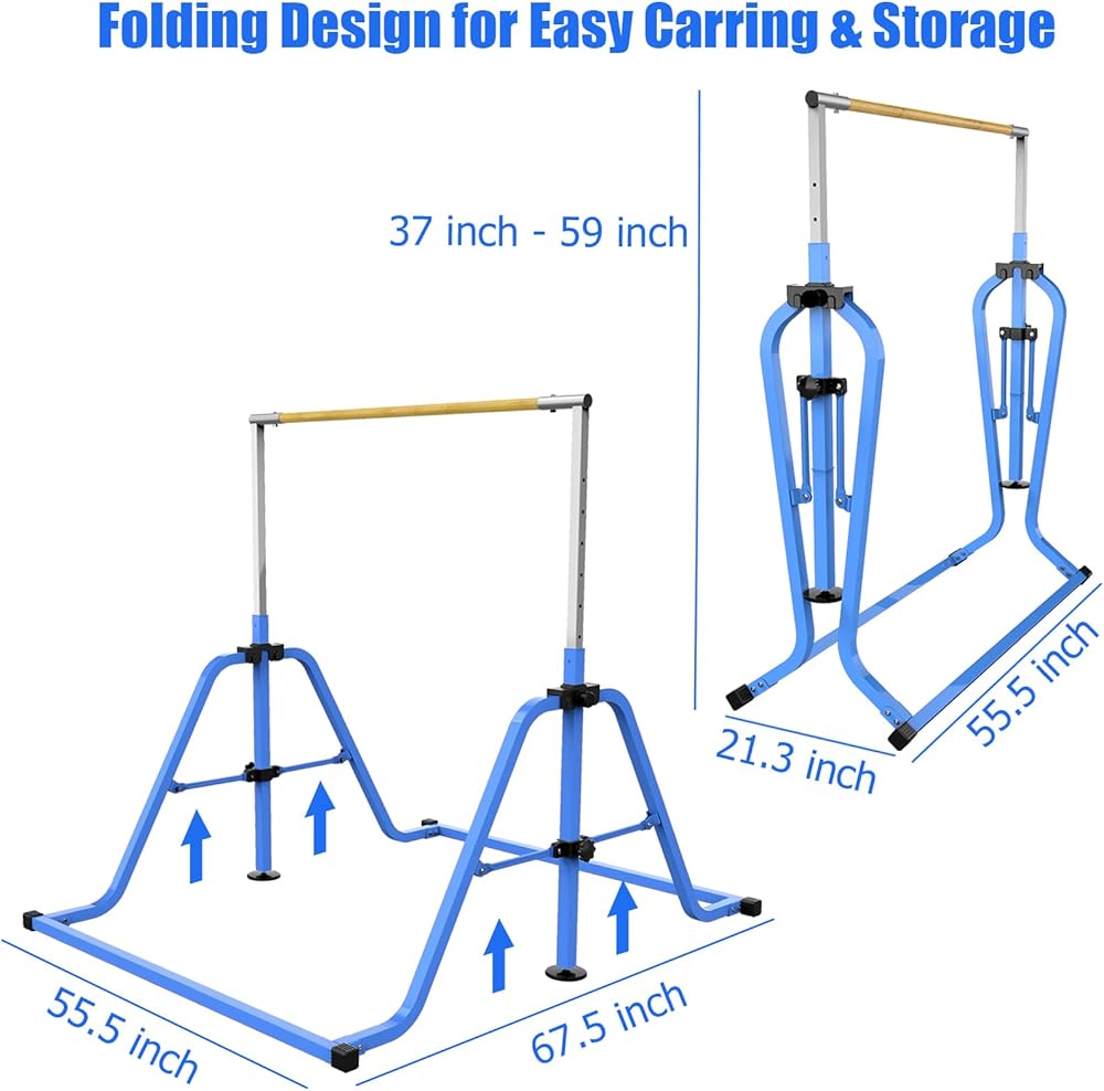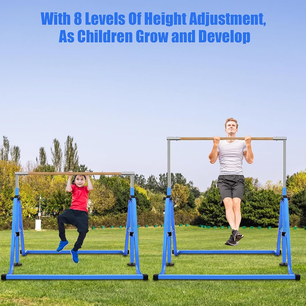 🎃𝟴 𝗟𝗘𝗩𝗘𝗟𝗦 𝗛𝗘𝗜𝗚𝗛𝗧 𝗔𝗗𝗝𝗨𝗦𝗧𝗠𝗘𝗡𝗧🎃 – Our kids gymnastics bar adopts double-screw locking system update in 2021, 8-level height adjustment. (37"/40.2"/43.3"/46.5"/49.6"/52.8"/55.9"/59") it easy to align and adjust the height of the kip bars, The plastic-coated spring pawl spin lock system makes height adjustment easier and safer. which can meet more different needs and fitness skills level.