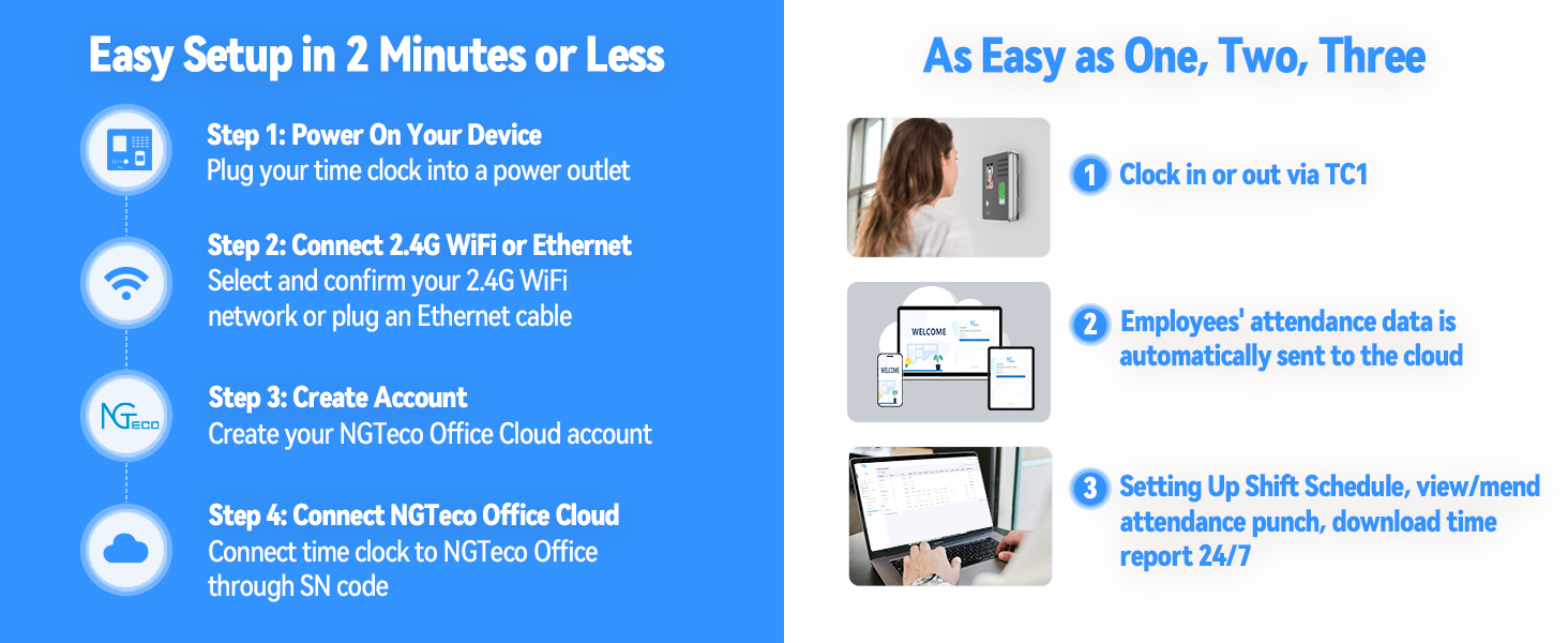برنامج سحابي قائم على المتصفح: سيسمح لك برنامج NGTeco Office الخاص بساعة التوقيت TC1 Cloud-Connect بعرض البيانات المثقوبة في الوقت الفعلي من أي مكان وفي أي وقت، وحساب بطاقات الوقت تلقائيًا، وإنشاء جداول زمنية وتعيين التحولات، وإرسال التقارير تلقائيًا من أي متصفح ويب.