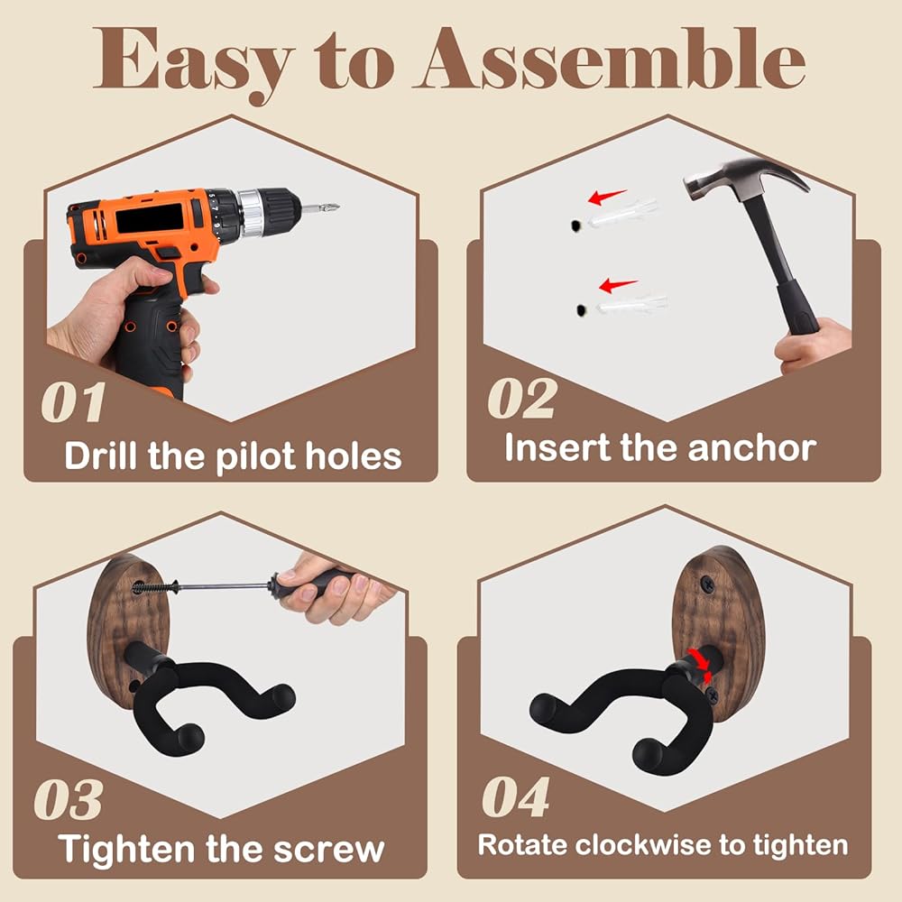 • سهلة التركيب: تأتي ملحقات الجيتار الصوتية هذه مع قاعدتين من خشب الجوز الصلب، وعلاقتين معدنيتين مع بطانة أكمام ناعمة، ومجموعتين من البراغي وأدوات التثبيت، ويمكن أن تساعدك ملصقات تحديد المواقع على تحديد الموقع بدقة على الحائط، كما تسمح البراغي الممتدة بتثبيتها مثبتة بشكل آمن على الجدران المختلفة. تحتاج فقط إلى مفك براغي متقاطع، سهل التجميع والتركيب على مجموعة متنوعة من الجدران في دقائق.