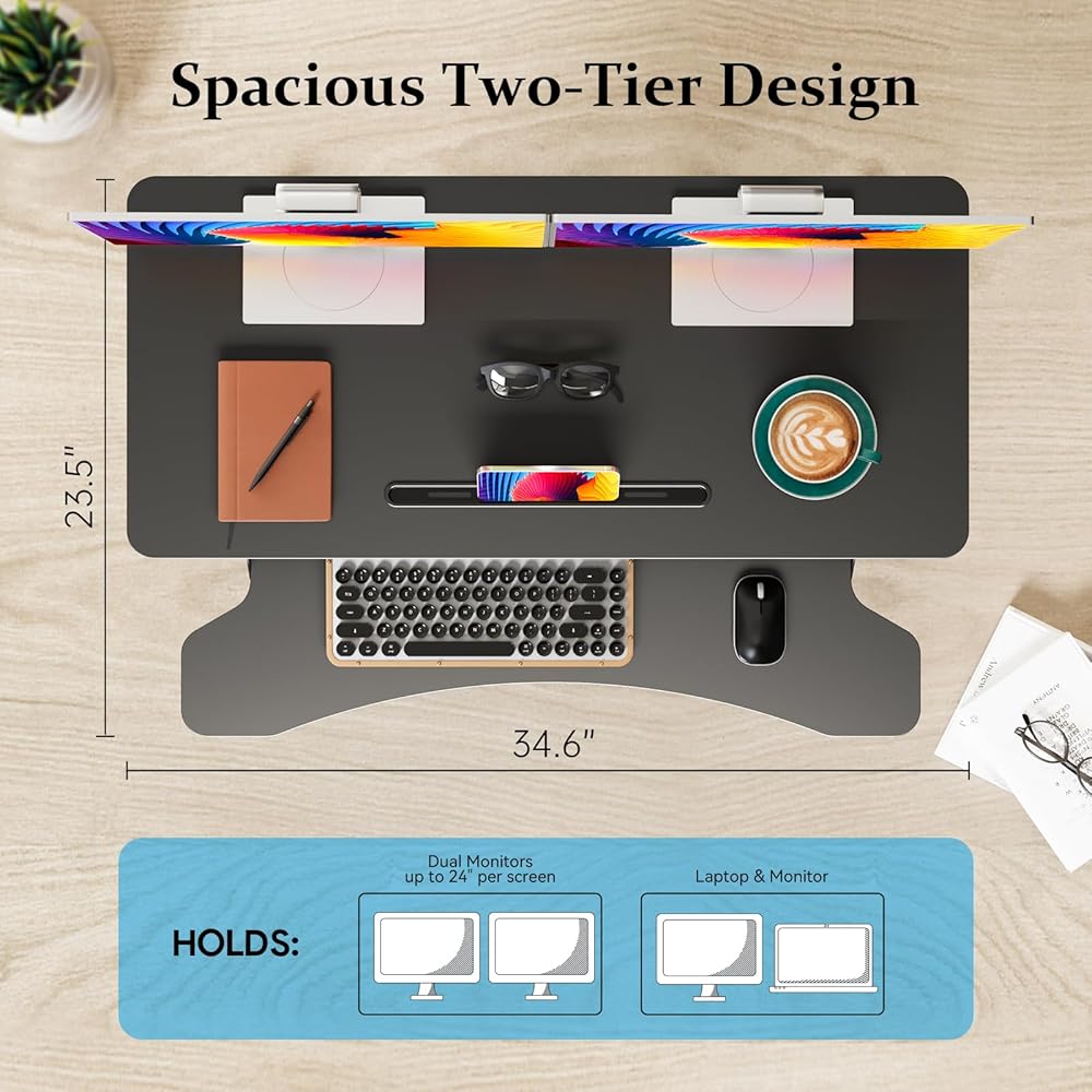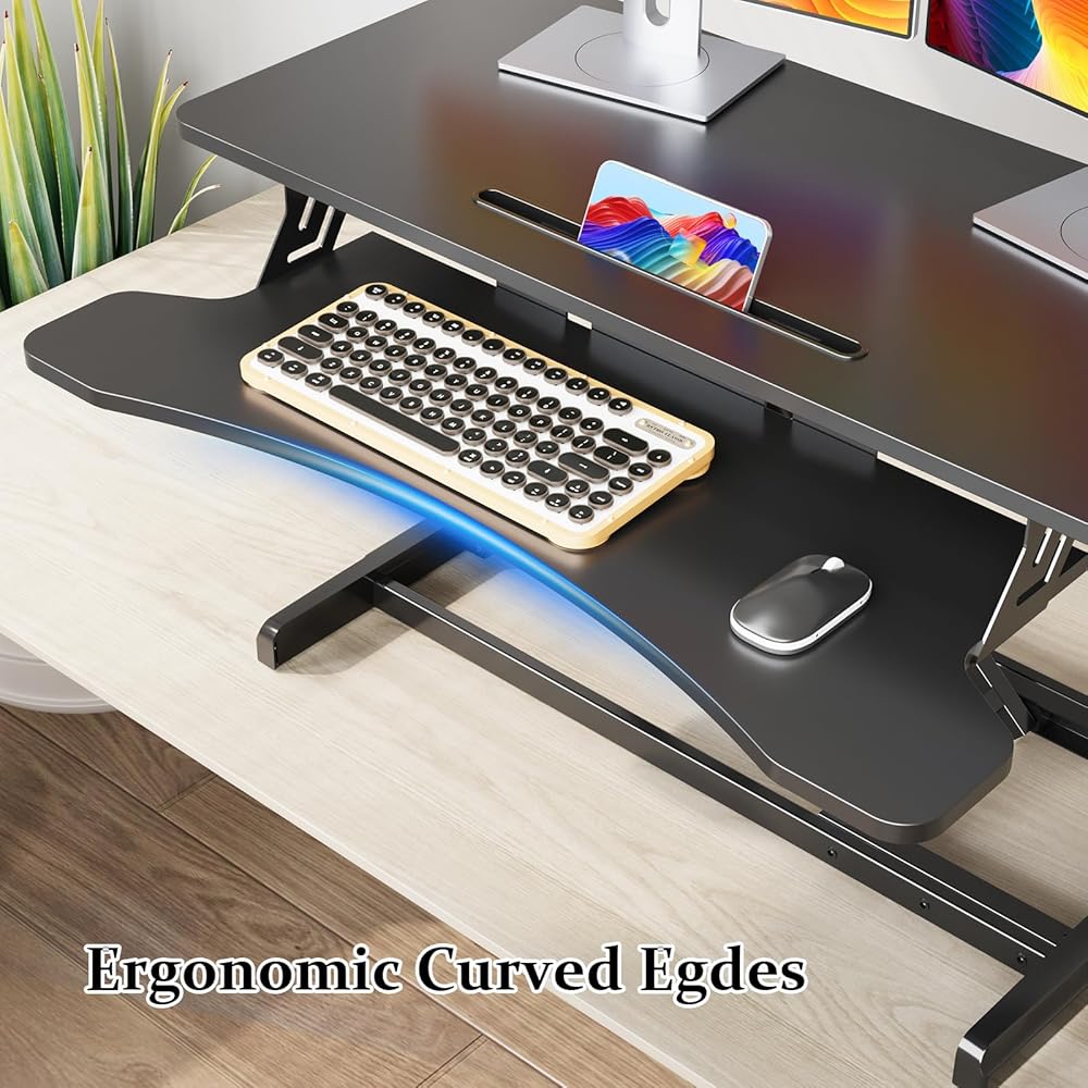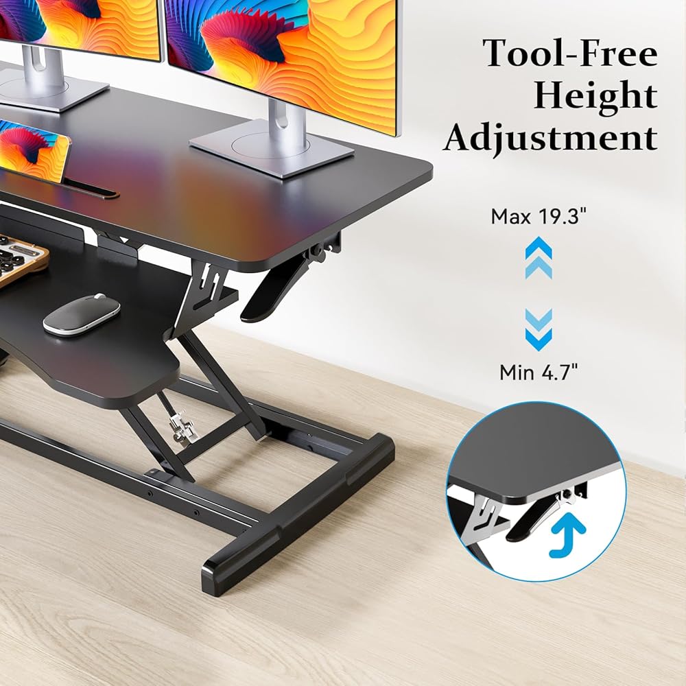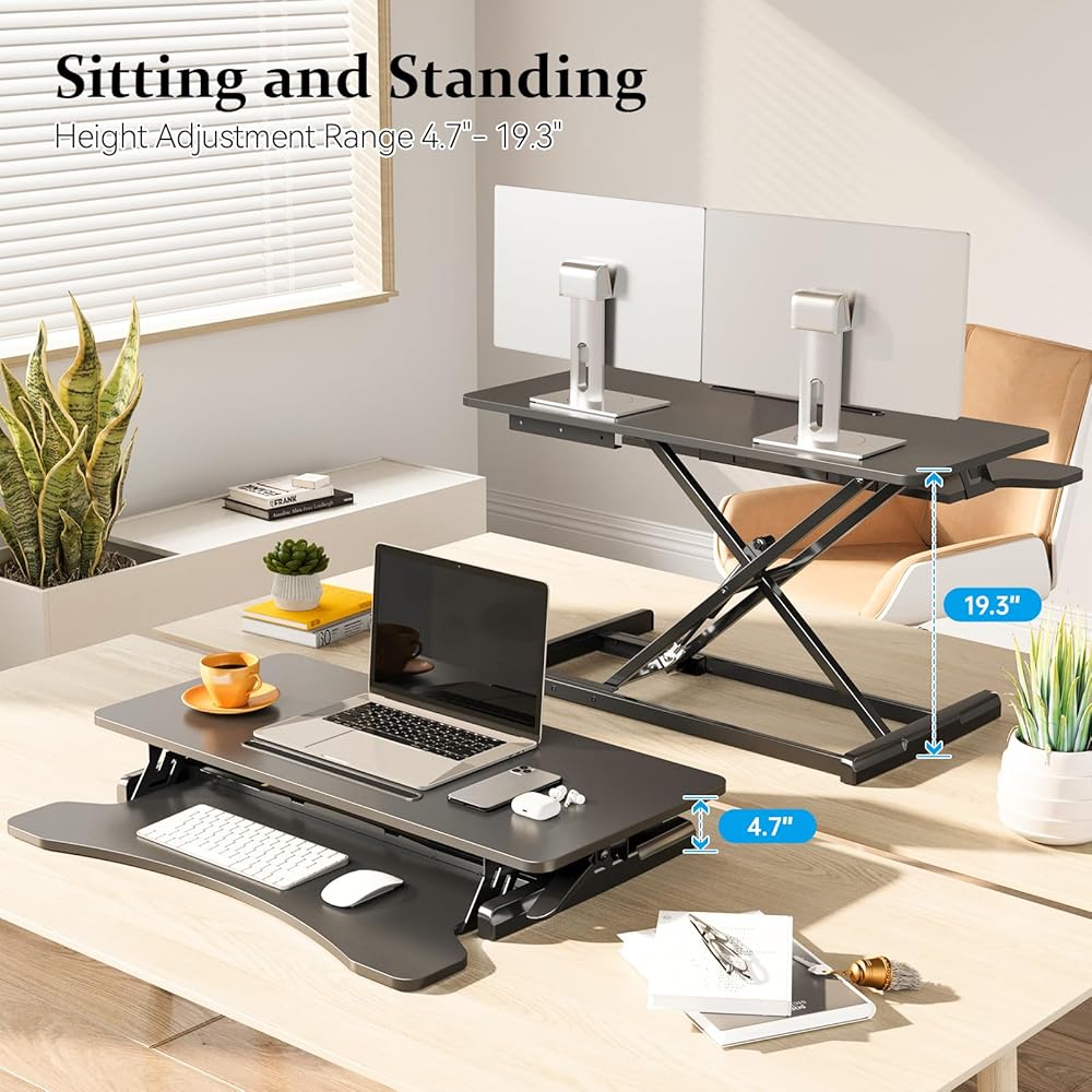 محول المكتب الدائم 32 بوصة ، ارتفاع قابل للتعديل صاخبة المكتب ، والجلوس السريع للوقوف على الطاولة مزدوجة مراقبة المحطة العمل للمكتب المنزلي مع صينية لوحة المفاتيح ، الأسود