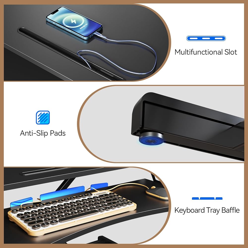 تصميم مريح: توفر لك الحافة المنحنية لدرج لوحة المفاتيح وضعية أفضل عند الجلوس أو الوقوف بالقرب من المكتب. قبل كل شيء، يتيح لك محول المكتب القابل للتعديل الارتفاع إيجاد توازن صحي بين الجلوس أو الوقوف