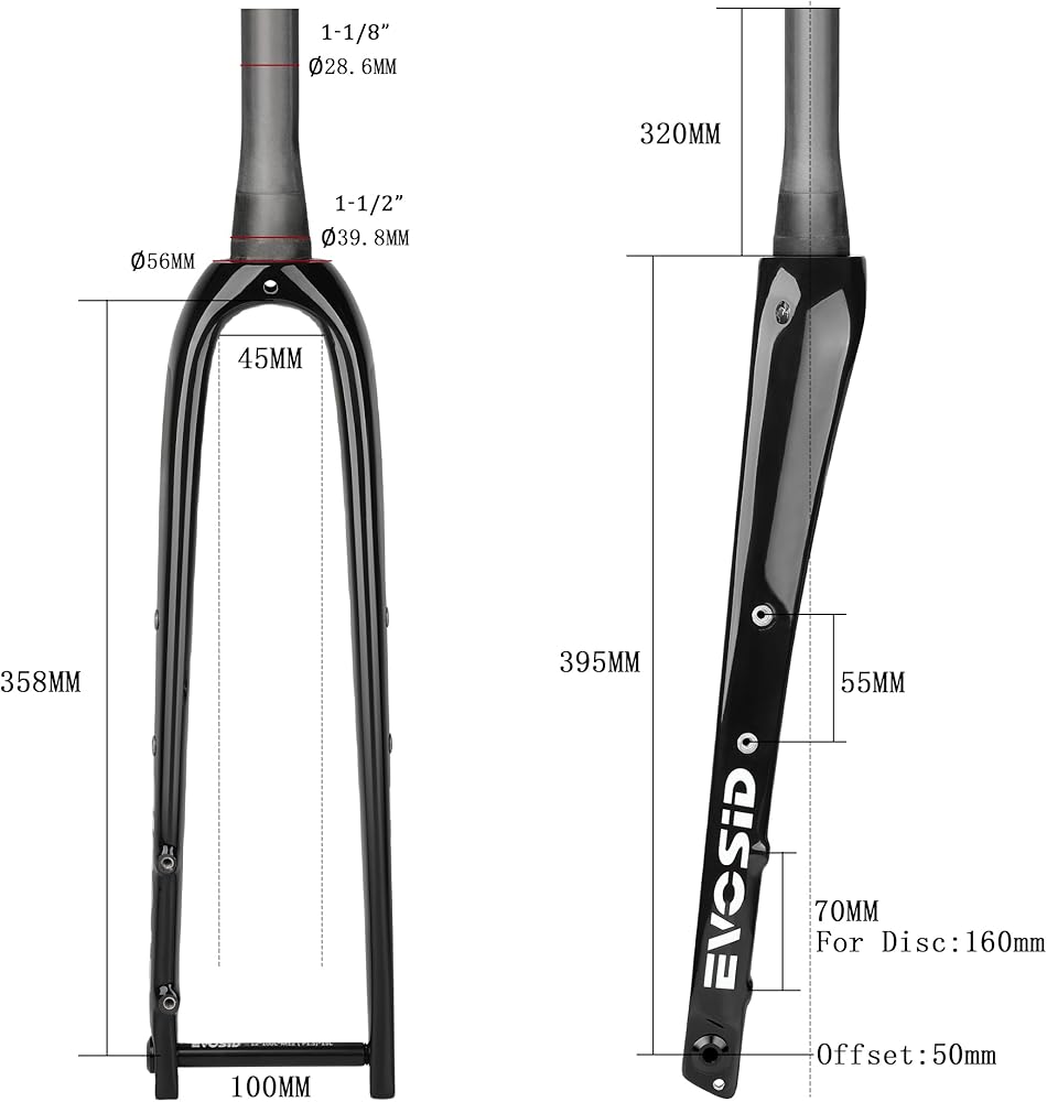 • 【Specifications】Material:T800 Full Carbon Fiber.Weight:1lb.Riser Diameter:Upper tube28.6mm.Lower pipe39.8mm,Max tire size:700C * 45mm,Steerer Tube Length:320mm,Steerer Tube Diameter:28.6mm,Shoulder Cap:56mm