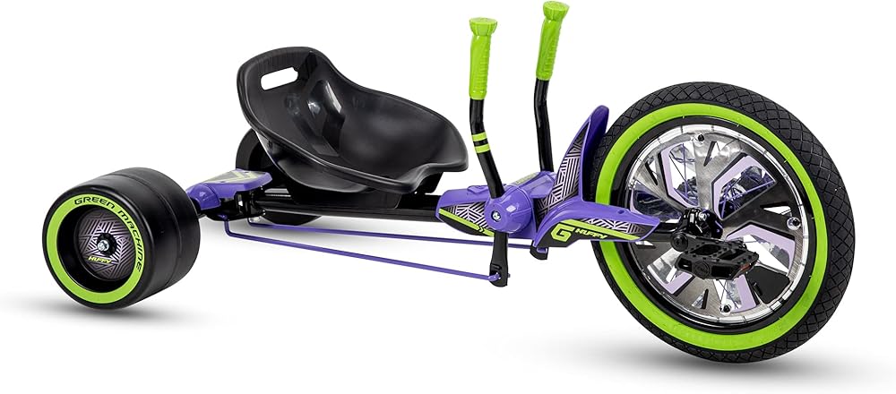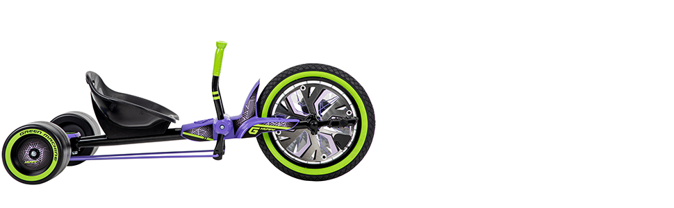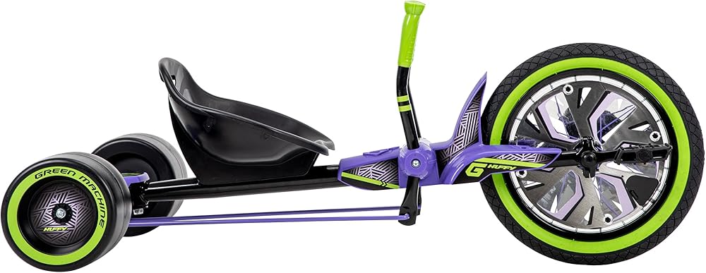 This 16 Inch Green Machine brings the fun of the original Green Machine to kids ages 5 to 8 years old with a maximum weight of 80 pounds. It's easy for kids to ride thanks to the dual-stick controls; simply pedal the front wheel and use the sticks to turn left and right! It's easy to perform fun spins and drifts thanks to the durable plastic rear wheels. The air-filled rubber front tire provides traction for acceleration and stopping. The purple body is accented by green features on the wheels, handlebar grips, and Green Machine graphics. The steel frame is built to last and is backed by Huffy's limited lifetime frame warranty.