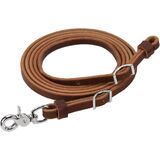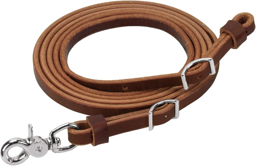 Weaver Horizons Flat Roper Rein The Horizons Collection offers great basic tack perfect for everyday riding. Handcrafted from durable, weather resistant harness leather, this rein features a nickel plated scissor snap and nickel plated conway adjustments. A skived center offers a slim and flexible feel. Measures 1/2" x 8'. Features: Handcrafted Durable Weather resistant harness leather Nickel plated scissor snap and conway adjustments