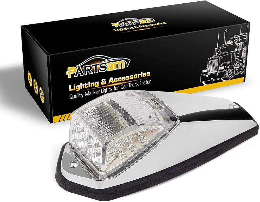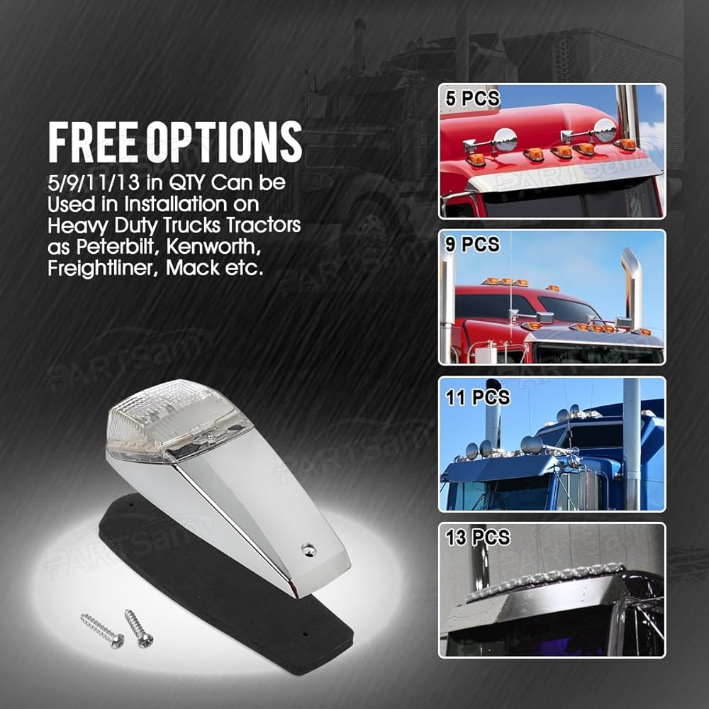 عالمي للشاحنات، والمقطورات، والجرارات، وشبه المقطورة، والشاحنات القلابة، والحافلات، والقوارب، والمركبات الخاصة، إلخ. مصباح علامة كابينة الشاحنة 5 قطع من بارتسام 17 مصباح LED كهرماني للسقف العلوي مع قاعدة من الكروم لاستبدال مصباح مقطورة الشاحنة لبيتربيلت/كينورث/ Freightliner//Mack/Autocar Hayes، متوافق مع DOT.