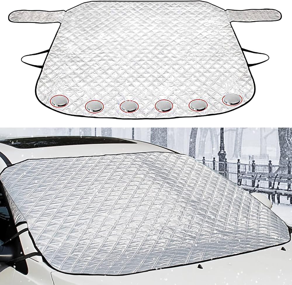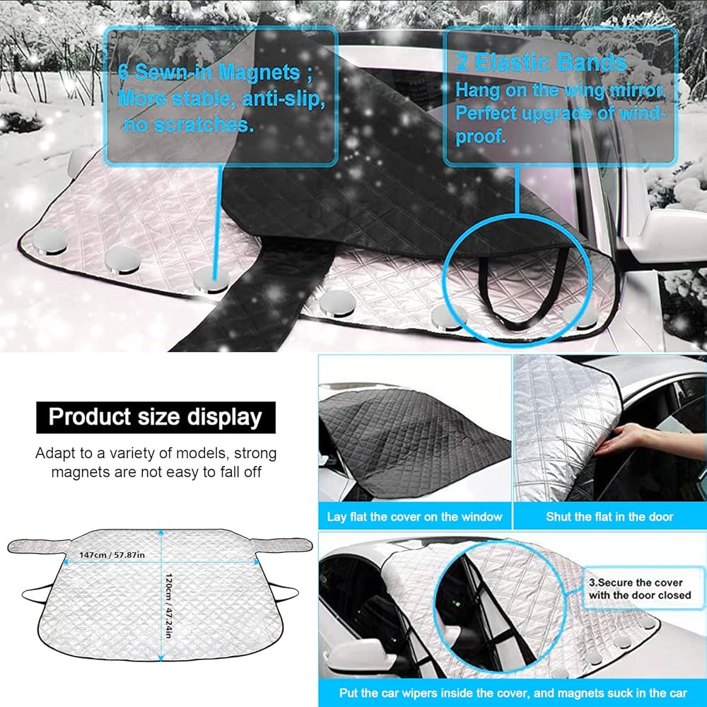 • Our Windshield Snow Cover features a windproof design with 6 pieces of magnets for superior adsorption and stability. The side wings prevent scratches, and elastic bands provide theft protection, making it suitable for use in strong winds.
