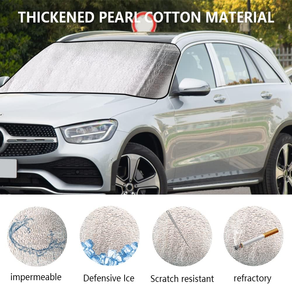 • <ul> <li>Pearl Cotton Material: Windshield winter cover made of pearl cotton fabric. Thickened Car snow cover will be sturdy enough to protect your car windshield from damage in all seasons, especially defend snow, ice, frost in winter.</li> </ul>