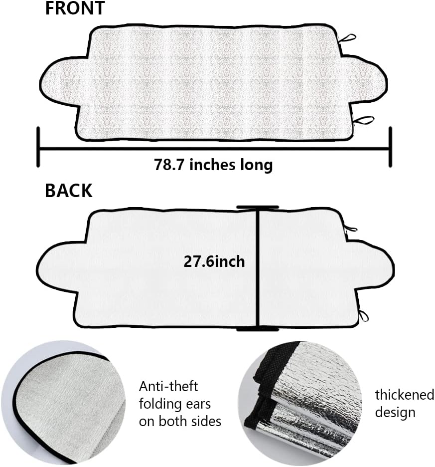 • <ul> <li>Fit for Universal Cars Size: The size of the cover is 200 x 70 cm (78.7" x 27.6"). Work as car windshield snow cover, Compact SUV windshield cover or car windshield snow cover for most model of vehicles. (Note: Please measure your windshield size before purchasing to ensure the product fits.)</li> </ul>