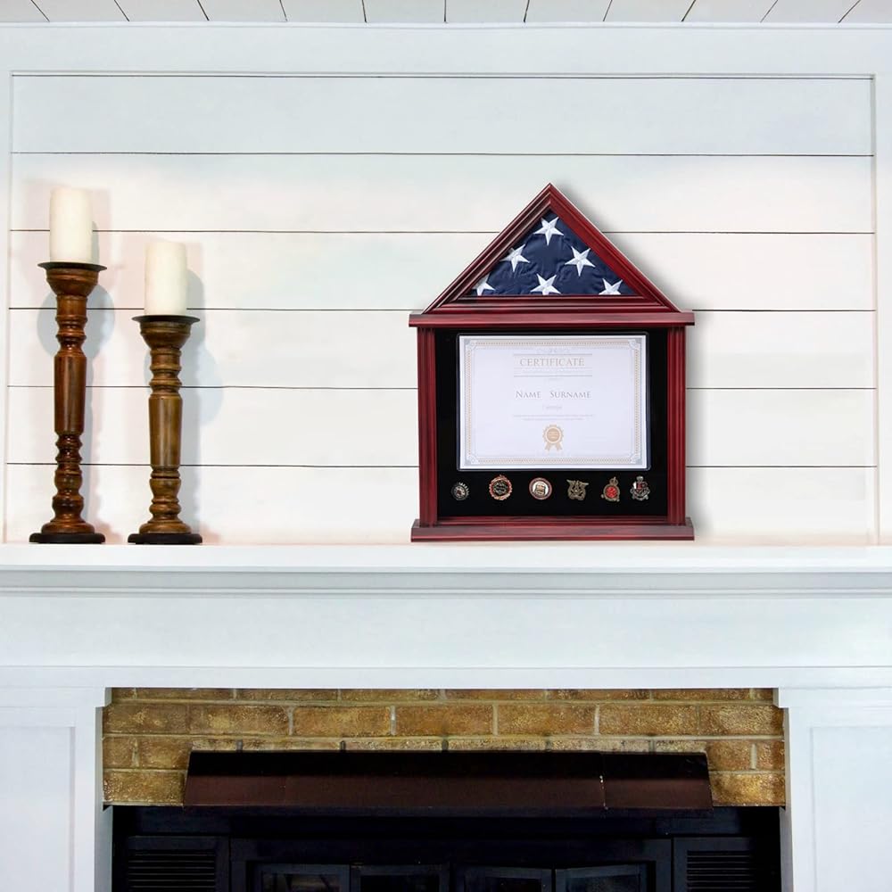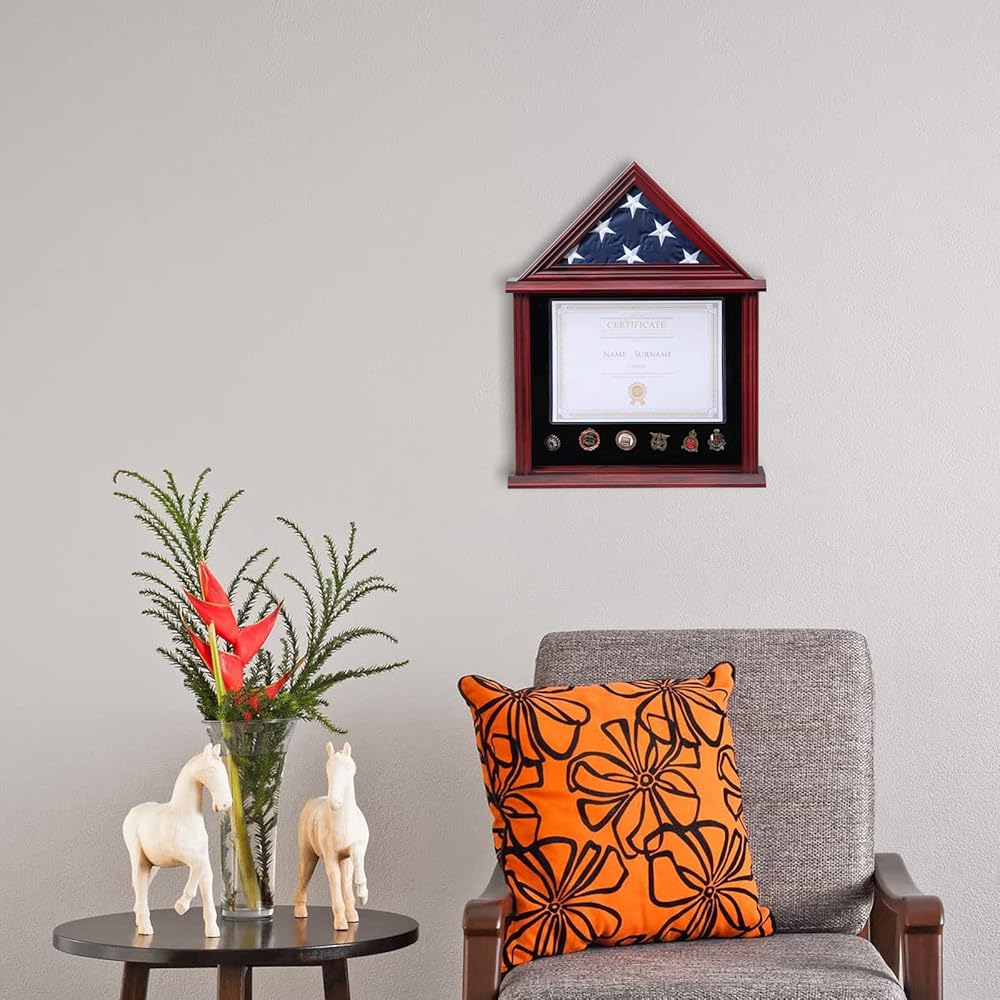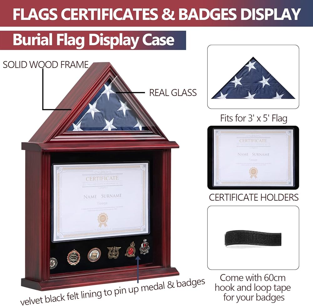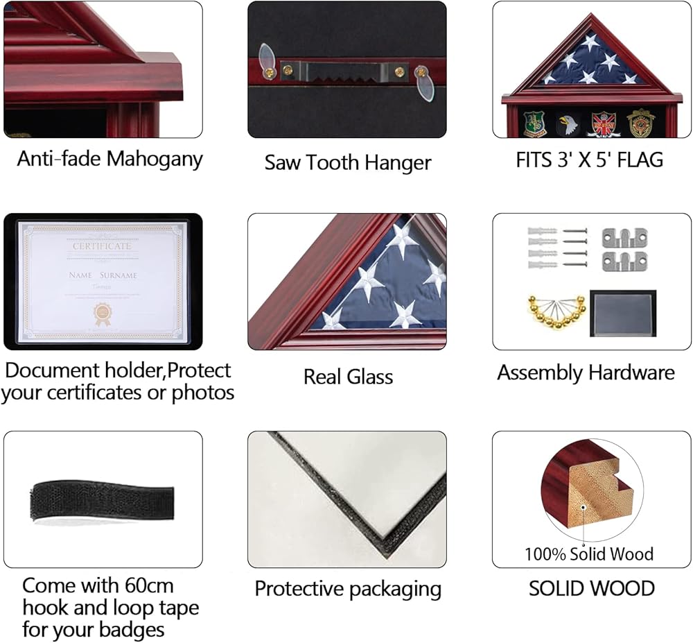 مواد عالية الجودة - علبة عرض علم الدفن مصنوعة من الخشب الصلب، مع لمسة نهائية من الماهوجني وواجهة زجاجية حقيقية سميكة عالية الدقة. قم بحماية العلم وشهادة الشهادة والشارات من الغبار والرطوبة والخدوش، مما يجعلها رائعة لسنوات. يأتي مع حامل مستندات لحماية شهاداتك القيمة ومستنداتك الشخصية.