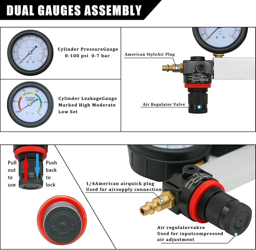 • 【مبدأ عمل كاشف التسرب 】-- بمجرد توصيل جهاز اختبار التسرب بإحدى الأسطوانات، يتم تغذية الهواء المضغوط (45-100 رطل لكل بوصة مربعة) إلى تلك الأسطوانة المحددة من خلال منظم الضغط المدمج. يتم التشخيص من خلال ملاحظة كمية التسرب المشار إليها على مقياس تسرب الأسطوانة ومن خلال الاستماع إلى التسرب في نقاط مختلفة من نظام السيارات. يرجى ملاحظة: جهاز اختبار تسرب الأسطوانة هذا غير مناسب للأسطوانة الضحلة.