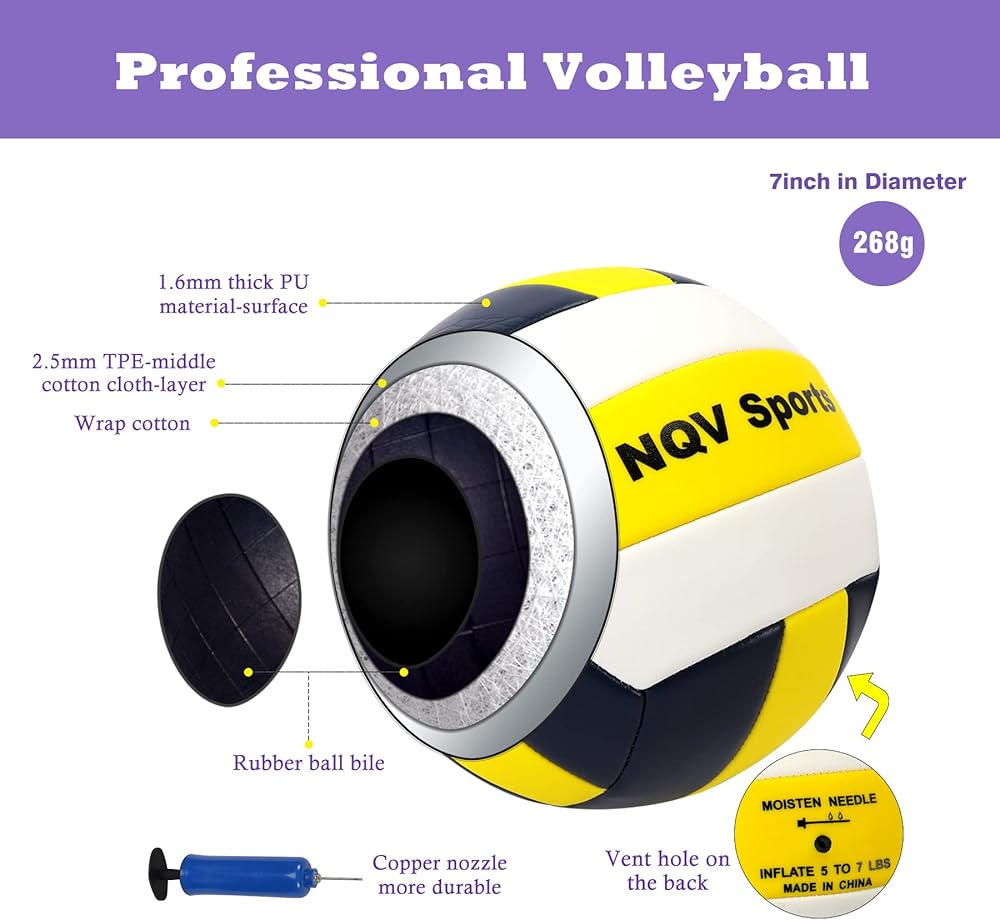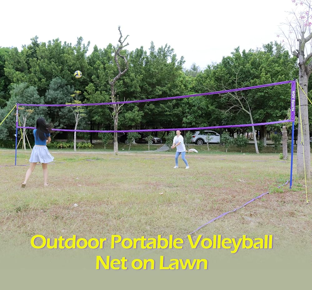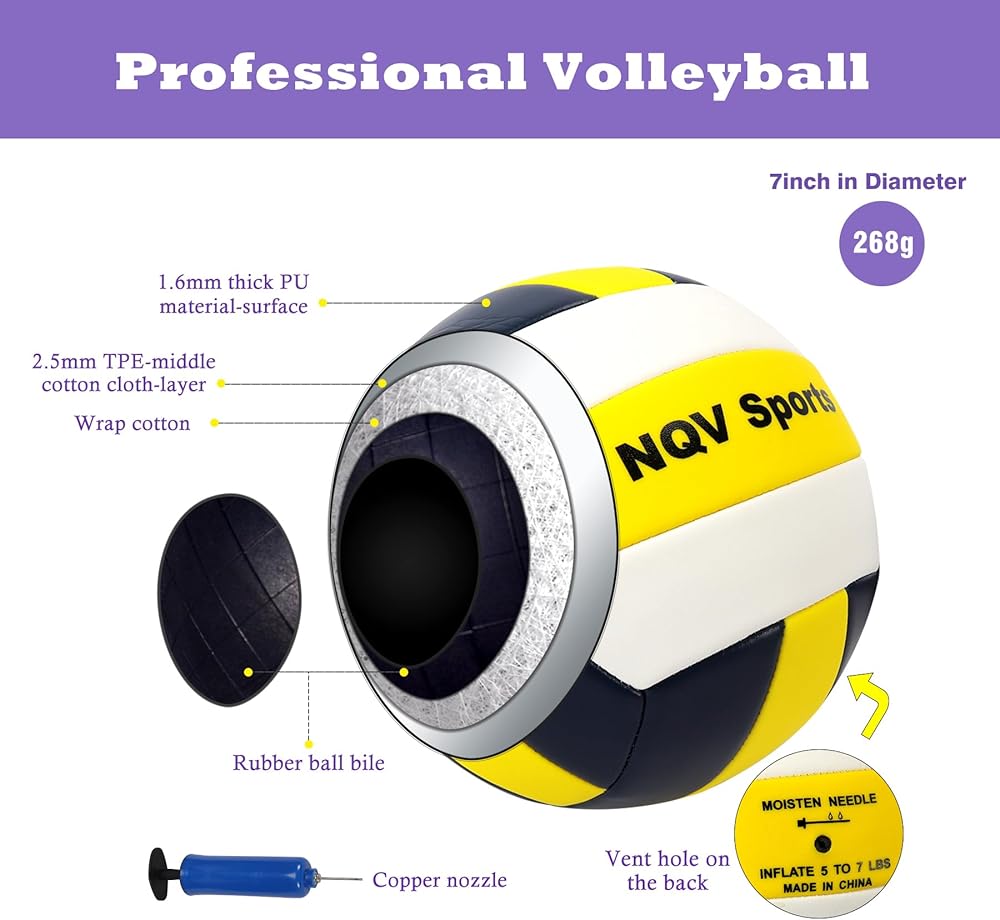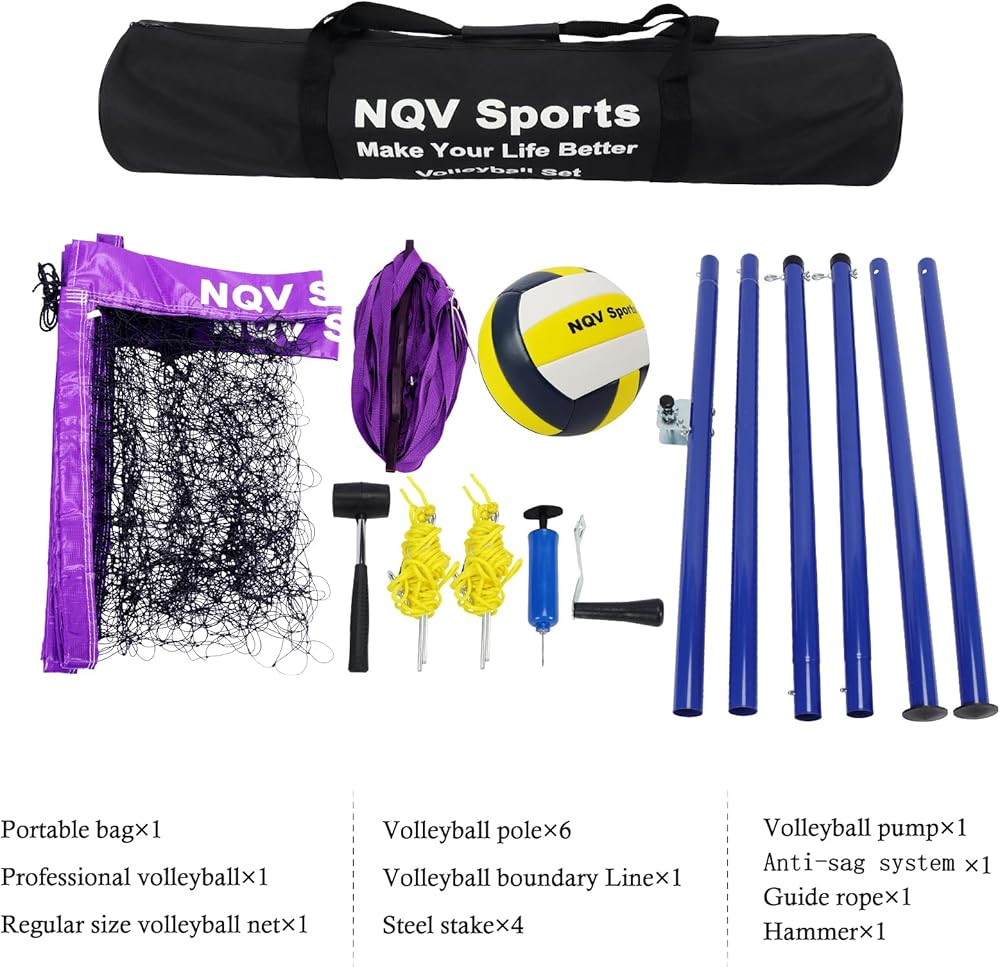 Professional Volleyball Set for backyard/lawn/beach: NQV volleyball set includes 1 volleyball net, 6 steel volleyball poles, 1 official volleyball,1 inflation pump with needle, 1 boundary tape,1 portable carrying bag. Play volleyball with your friends and family when you have parties, cookout, BBQ.