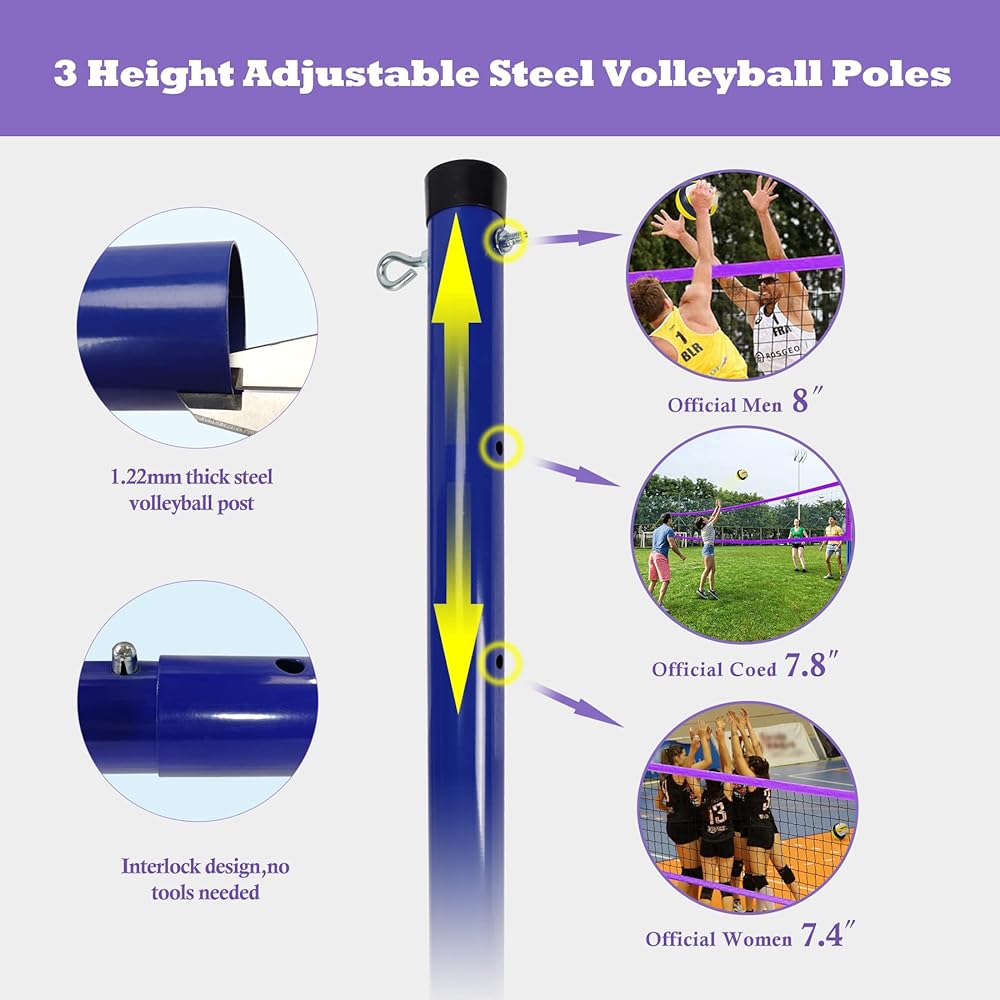 Height Adjustable Volleyball Poles: NQV volleyball net with poles are adjustable for 3 levels height. 8ft for men height, 7.8ft for co-play height, and 7.4ft for women height. It's an inground volleyball set for adults, not for kids and teens.