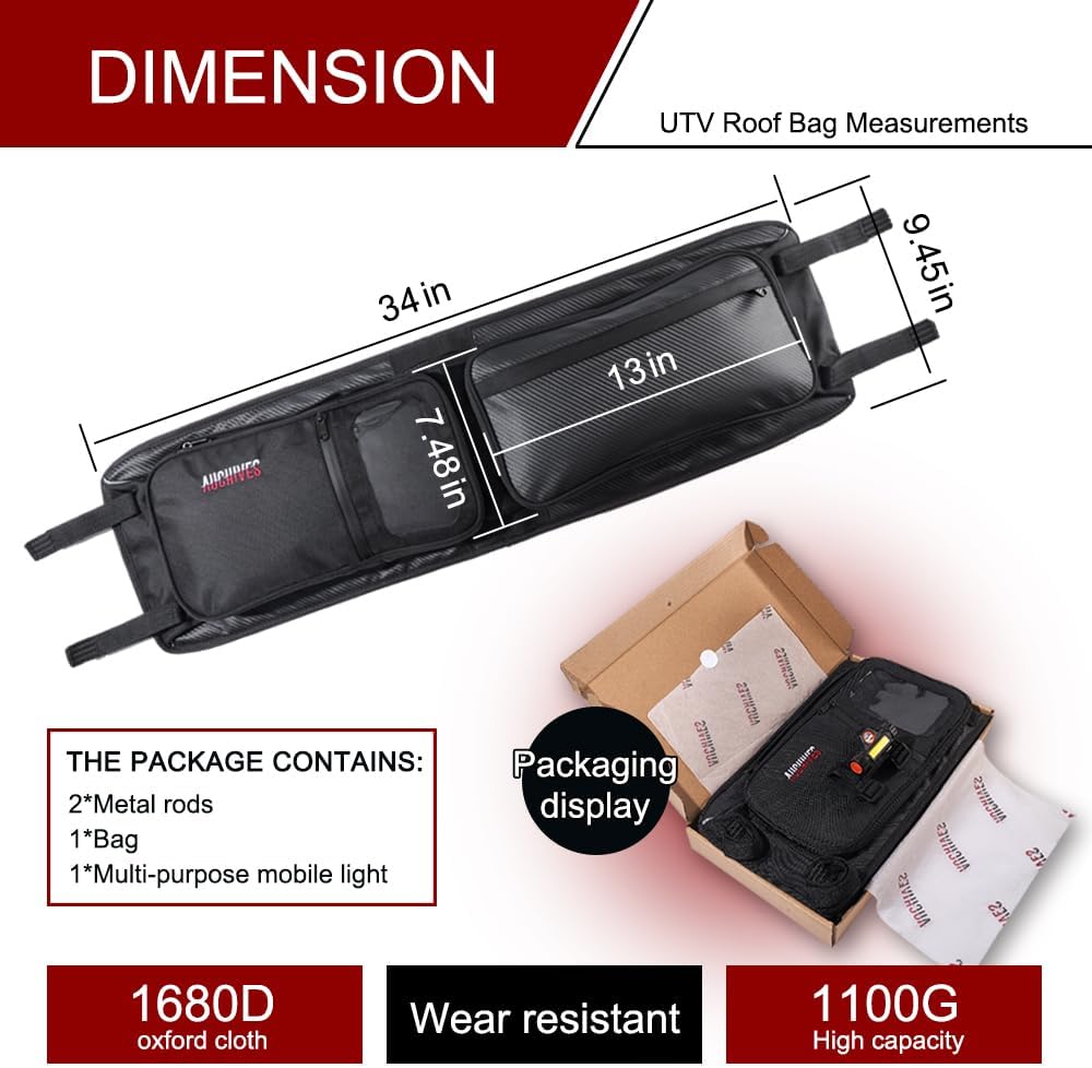 • 【Product and Size】Include:2*Metal rods;1*Bag;1*Multi-purpose mobile light.Size:The roof bag is 34in long and 9.45in wide.The package size:16.9*9.8*2.8in.