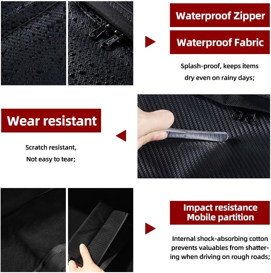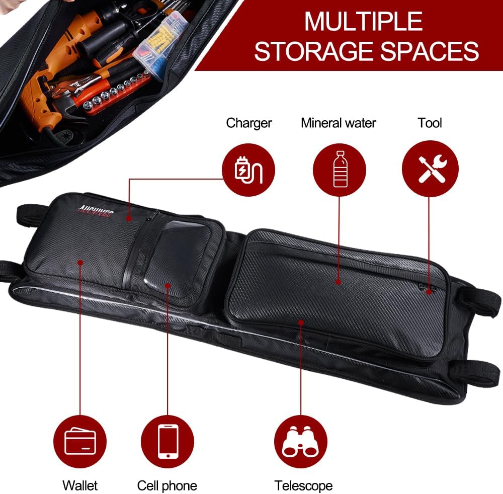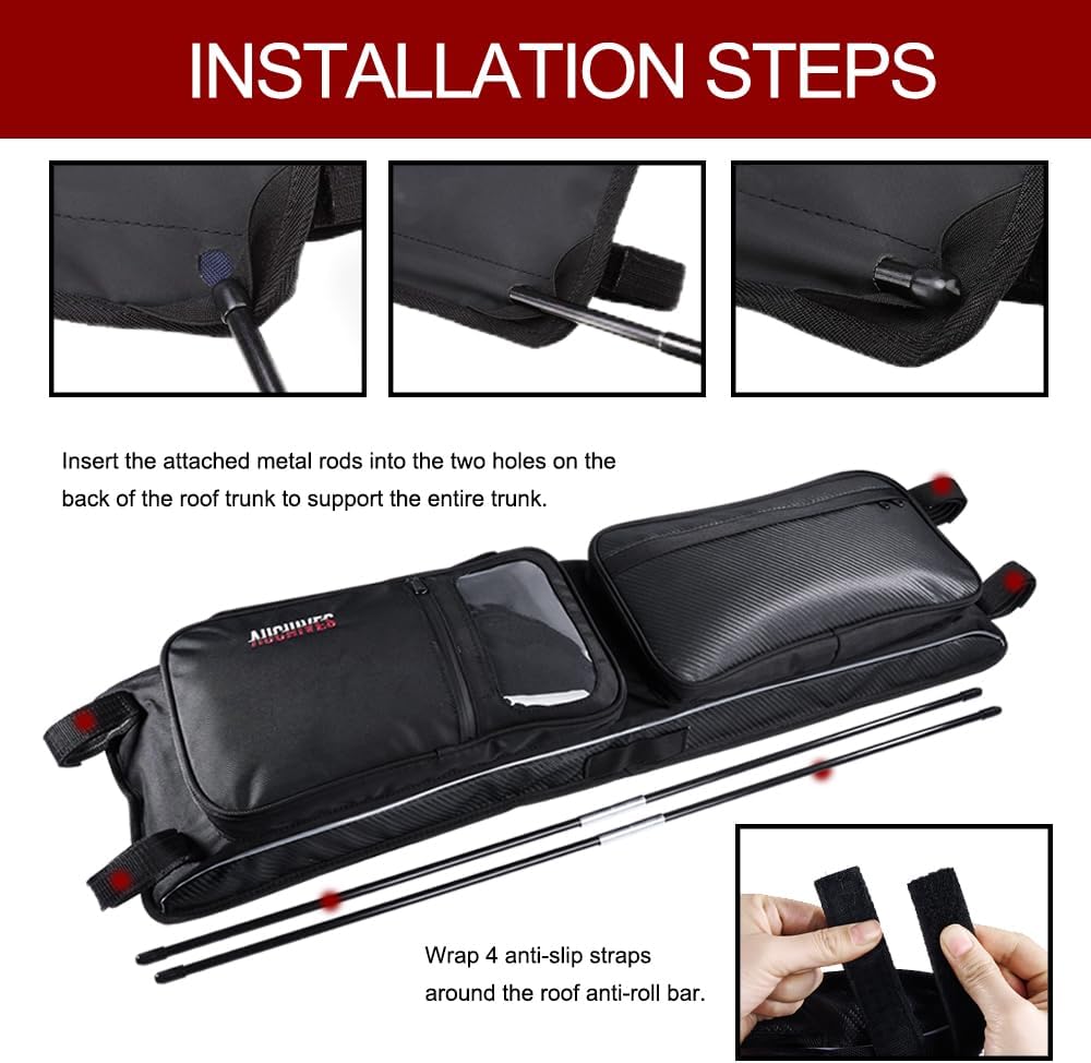 • 【High quality and performance】The fabric of the overhead bag is made of 1680D Oxford cloth, which is waterproof, scratch-resistant and not easy to tear; The bottom surface is coated with a waterproof coating to keep the item dry even on rainy days.Internal shock-proof cotton prevents valuables from cracking when driven on rough roads. There are white reflective bone strips on both sides, easy to find the zipper opening at night.