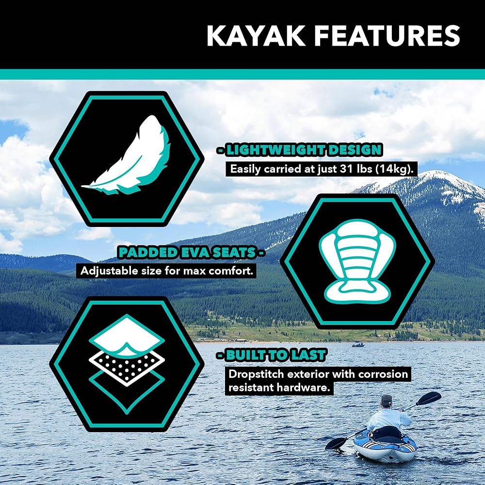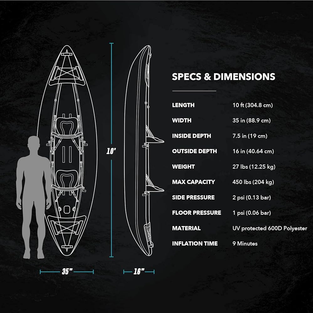 • صغير الحجم وسهل الاستخدام: عند تفريغه من الهواء للنقل، يبلغ مقاس هذا الكاياك القابل للنفخ 66 سم فقط (طول) × 40.64 سم (عرض) × 20.32 سم (ارتفاع) ويتناسب بشكل جيد مع حقيبة الحمل المتضمنة. تصميم خفيف الوزن يجعل من السهل التعامل معه بواسطة شخص واحد، ويزن 27 رطلاً فقط.