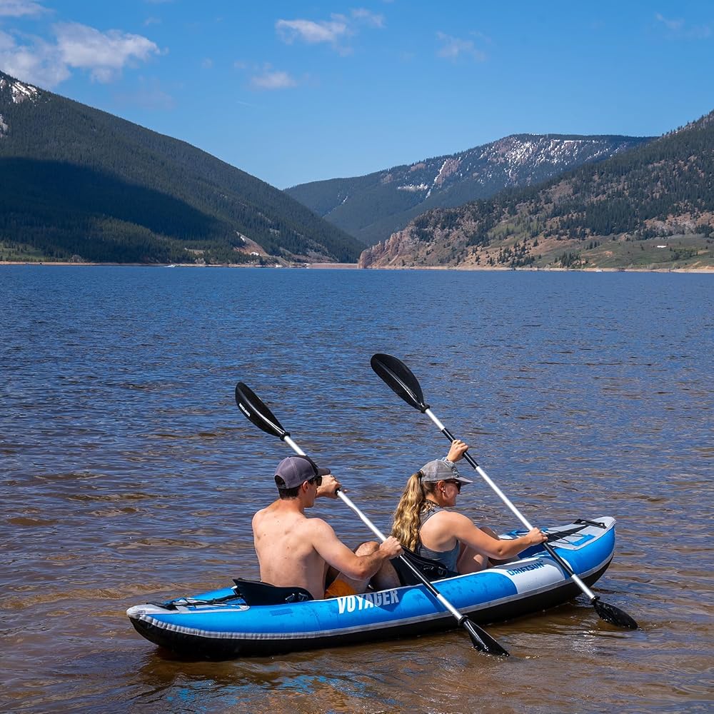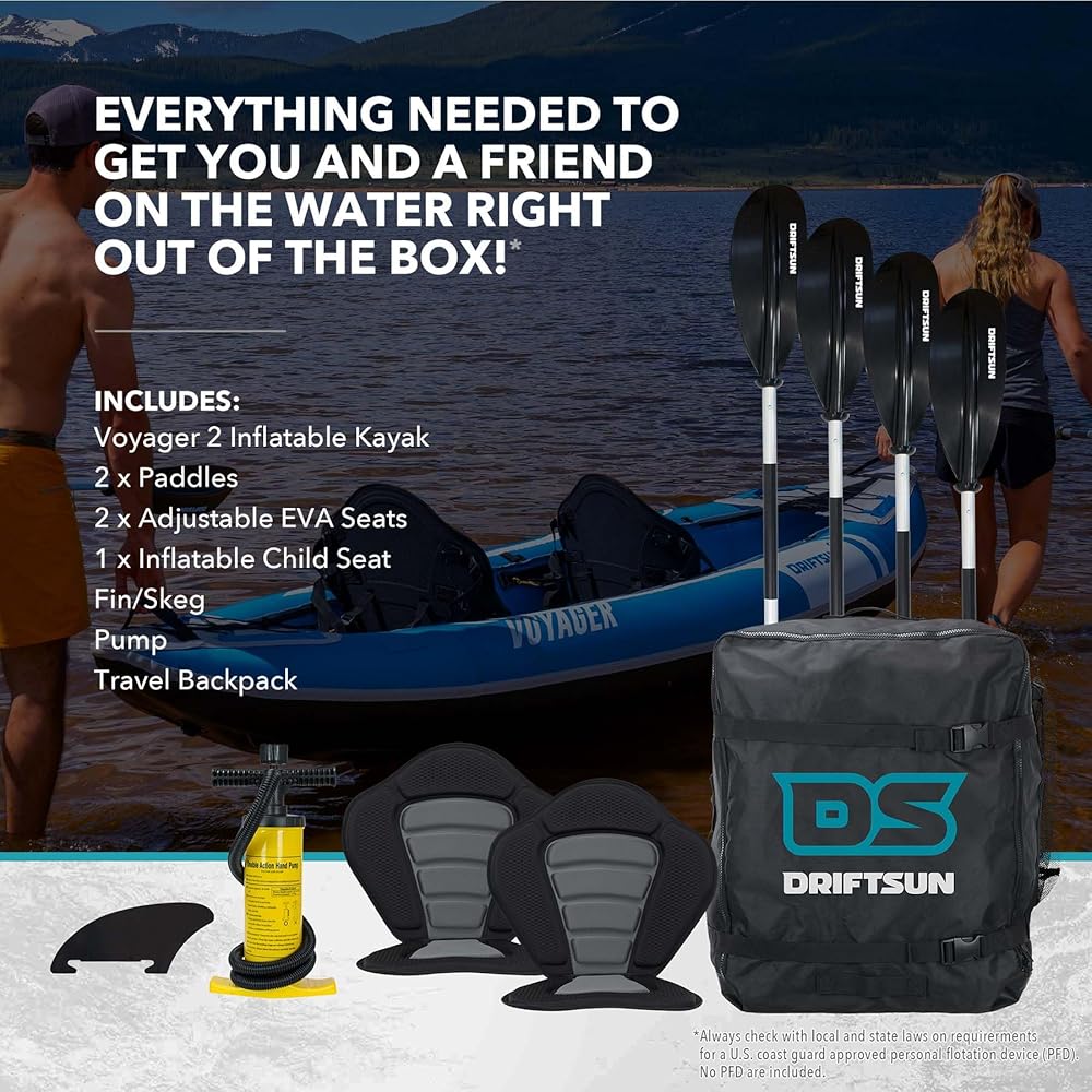 Driftsun Voyager نفخ الكاياك - 2 شخص جنبا إلى جنب كاياك قابل للنفخ، يتضمن 2 مجاذيف من الألومنيوم، 2 مقعدين مبطنين، مضخة عمل مزدوجة وحقيبة ظهر للسفر