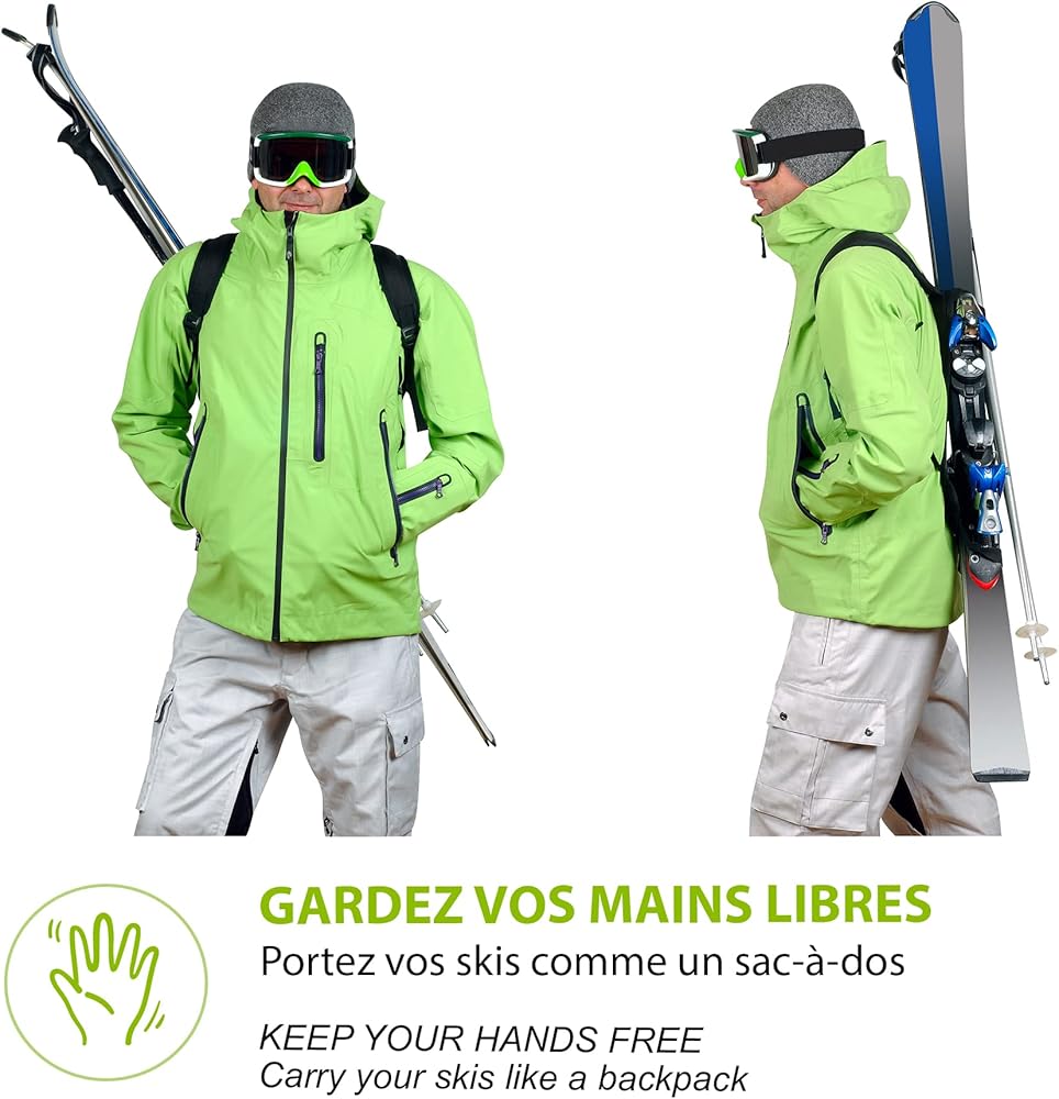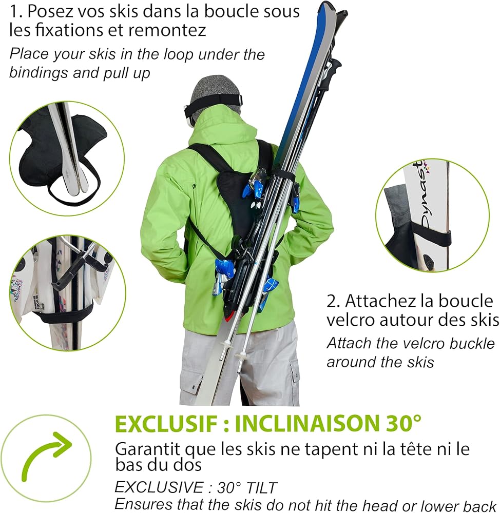 > Practical and comfortable: designed to make life easier for skiers, the Skiback is a patented product that allows you to carry your skis easily and comfortably. Its 30° inclination has been designed to avoid the impact of the skis on the head and lower back. The adjustable straps will allow you to adjust the Skiback at your convenience to distribute the weight.