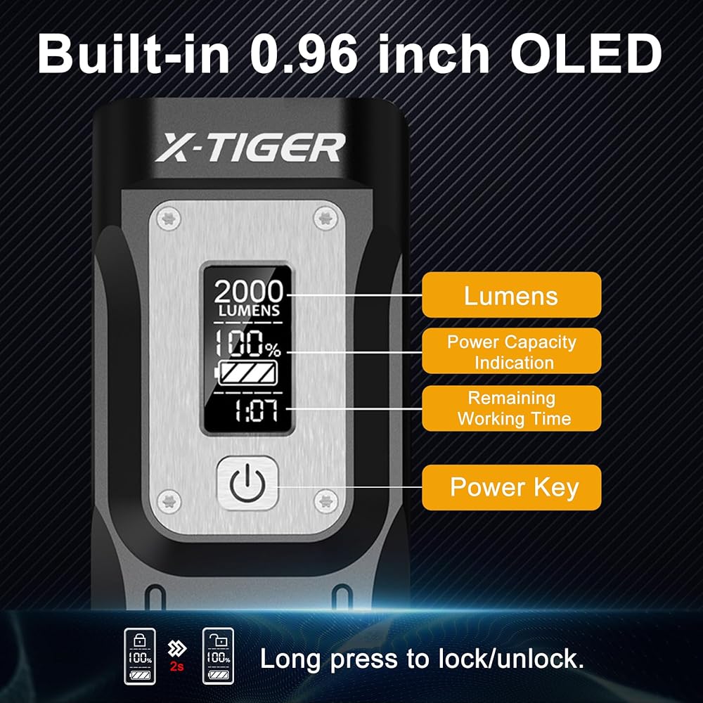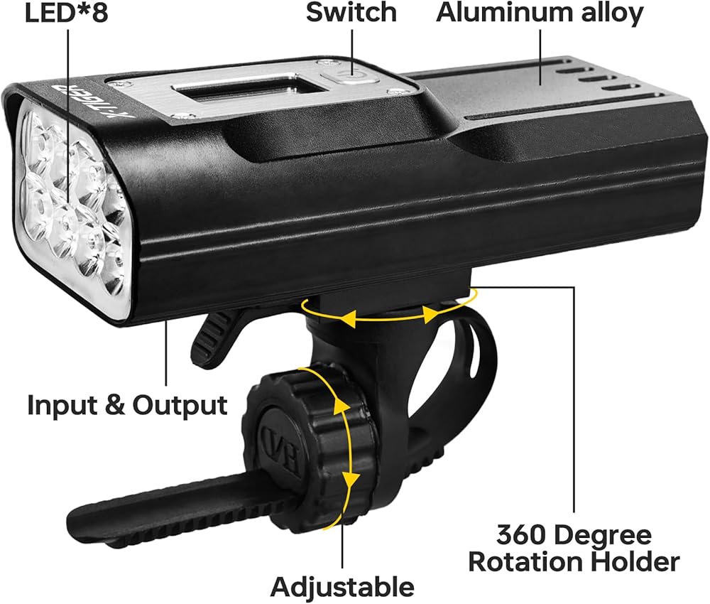 🚴♀️ 8 خرزات XPE خفيفة 🚴♀️ يتميز المصباح الأمامي X-TIGER بـ 8 خرزات XPE عالية الجودة و3 أوضاع سطوع ووضعين للفلاش. نقرة واحدة لتبديل وضع السطوع، انقر نقرًا مزدوجًا لتبديل وضع الفلاش. الحد الأقصى لومن يمكن أن يصل إلى 2000 ويمكن أن تستمر أطول مدة تصل إلى 24 ساعة. بفضل سبائك الألومنيوم عالية الجودة، توفر مصابيح الدراجة مقاومة للصدمات وتبدد الحرارة وتقاوم التآكل.