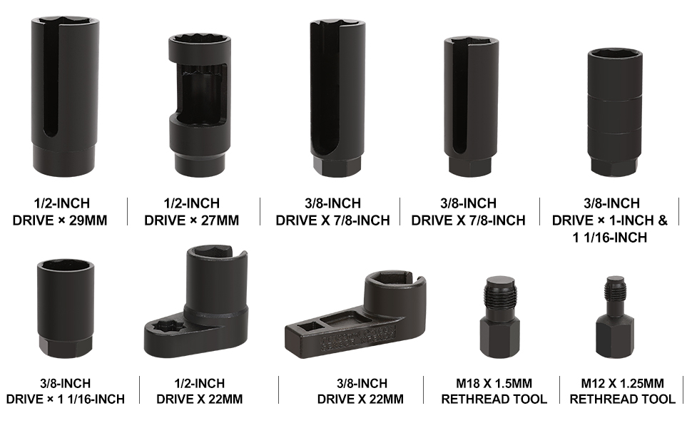 تشتمل هذه المجموعة على: مقبس مفتاح تفريغ محرك 29 مم 1/2 بوصة، مقبس حاقن محرك 27 مم 1/2 بوصة، وحدة إرسال زيت محرك 27 مم 3/8 بوصة مقبس 1 بوصة، مكنسة محرك 22 مم 3/8 بوصة مقبس التبديل، مقبس مستشعر O2 مُسخن مقاس 22 مم 1/2 بوصة، وحدة إرسال الزيت مقاس 27 مم 3/8 بوصة، مقبس 1-1/16 بوصة، محرك 22 مم 3/8 بوصة مفتاح مستشعر O2 6-Pt، M12 أدوات إعادة تركيب مستشعر O2 مقاس 1.25 مم وM18 × 1.5 مم، ومقبس مستشعر O2 للإزاحة العميقة مقاس 22 مم 1/2 بوصة.
