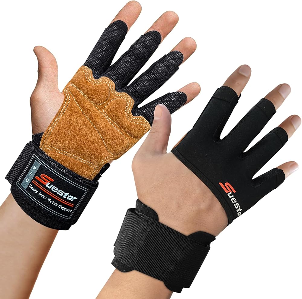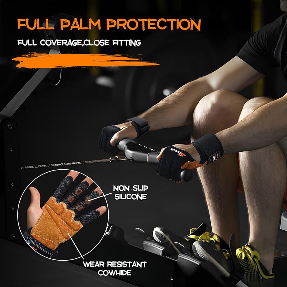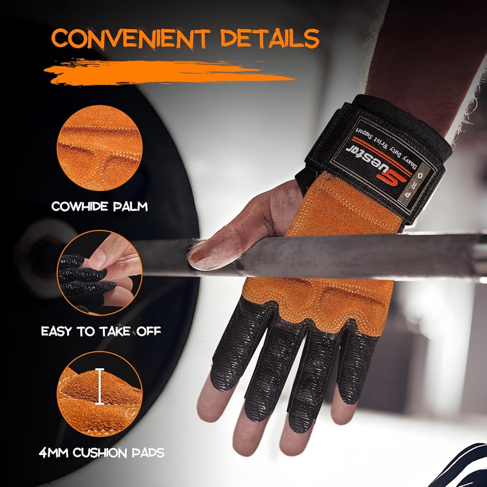 SueStar Weight Lifting Gloves, Heavy Duty Cowhide Palm Workout Gloves with Wrist Wraps Support, Full Palm Protection & Silicone Grips Gym Gloves for Weightlifting, Deadlifts, Exercise