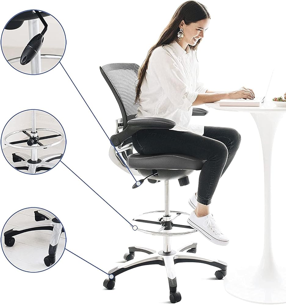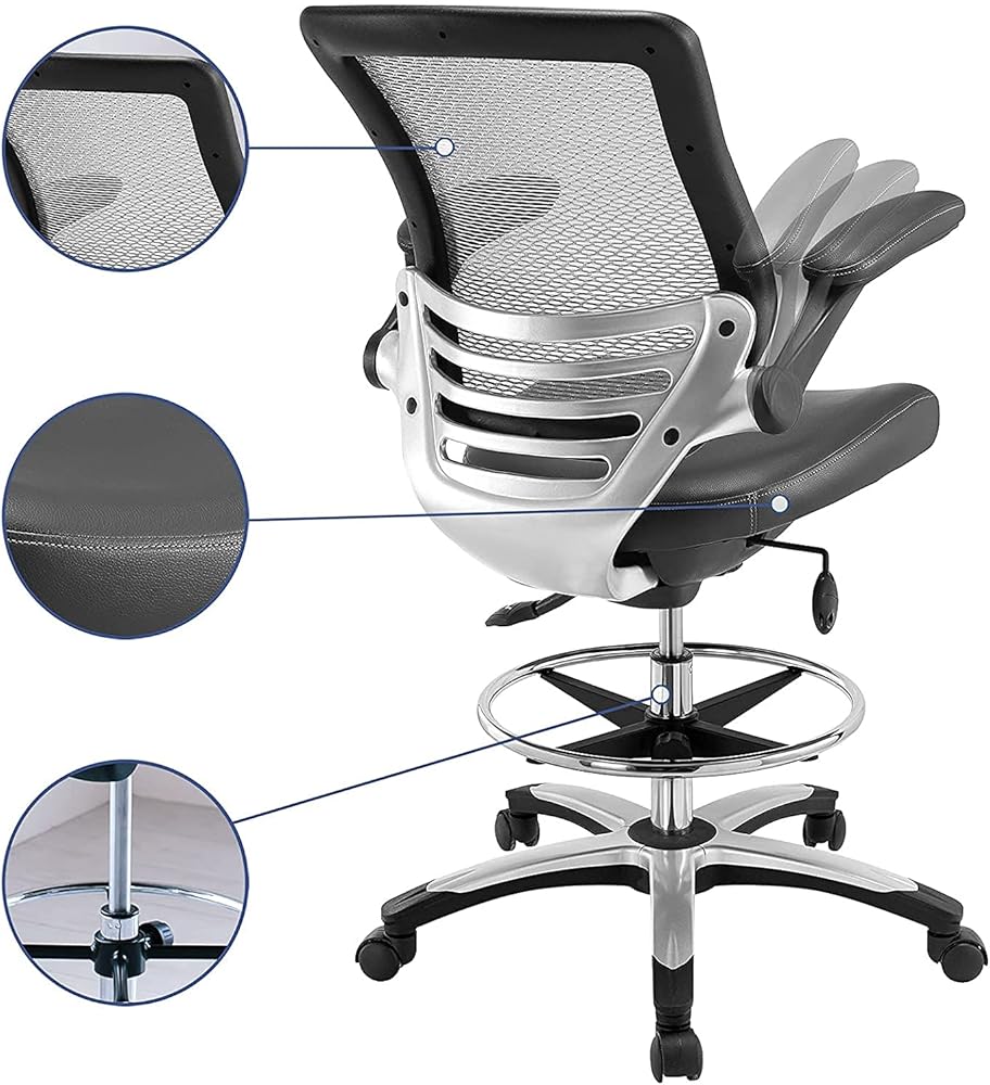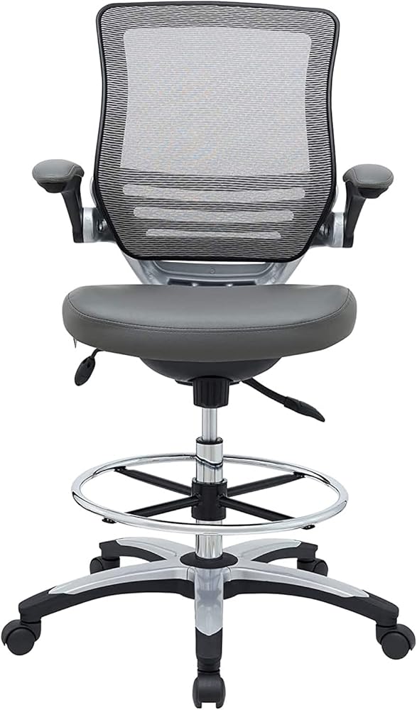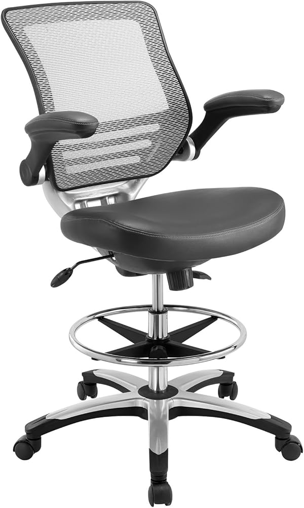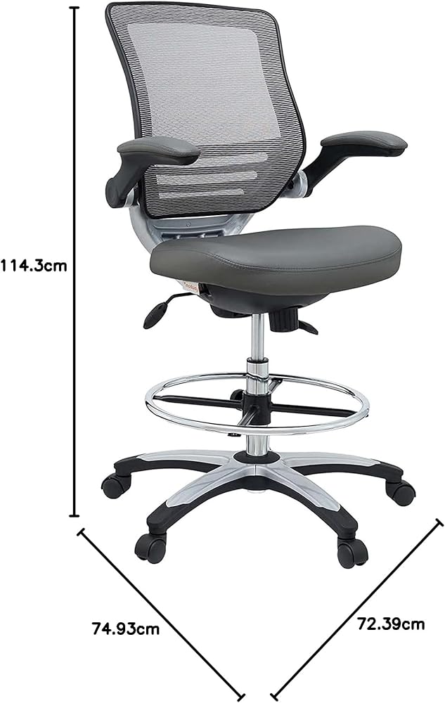 Welcome to a new era in functional comfort. The Edge Drafting Stool implements cutting edge ergonomics to deliver a comprehensive seating experience. Edge features a breathable mesh back for lower back lumbar support, padded waterfall vinyl seat to ease pain and pressure around your thighs, flip-up padded arms, foot ring with extra tall gas cylinder, and securely locks in place with a user friendly seat tilt plus tension control knob. Edge is a progressive minded drafting stool perfect for school, work, or home use. Set Includes: One - Edge Office Drafting Chair with Foot Ring, Mesh Back and Black Leatherette Seat Product Dimensions: Overall Product Dimensions: 27.5"L x 27.5"W x 41.5 - 49"H Seat Dimensions: 18"L x 19.5"W x 22 - 29.5"H Armrest Height: 32 - 39.5"H Backrest Dimensions: 19.5"H Armrest Dimension: 11"L x 3"W x 2.5"H Base Dimension: 27.5"L x 27.5"W