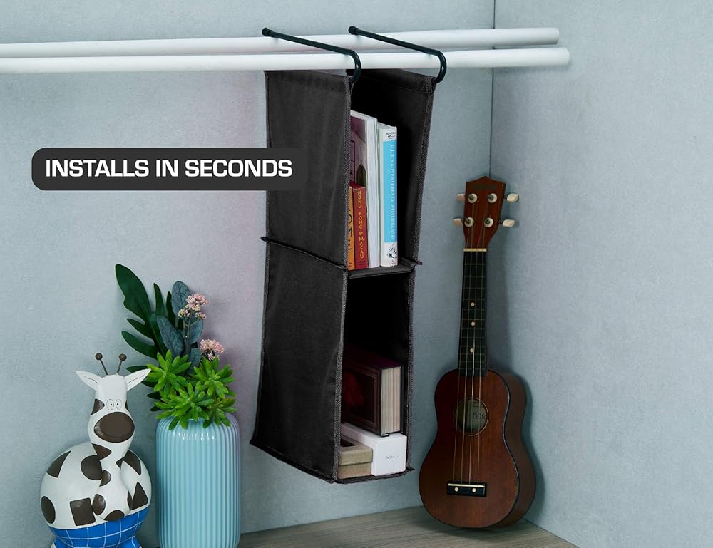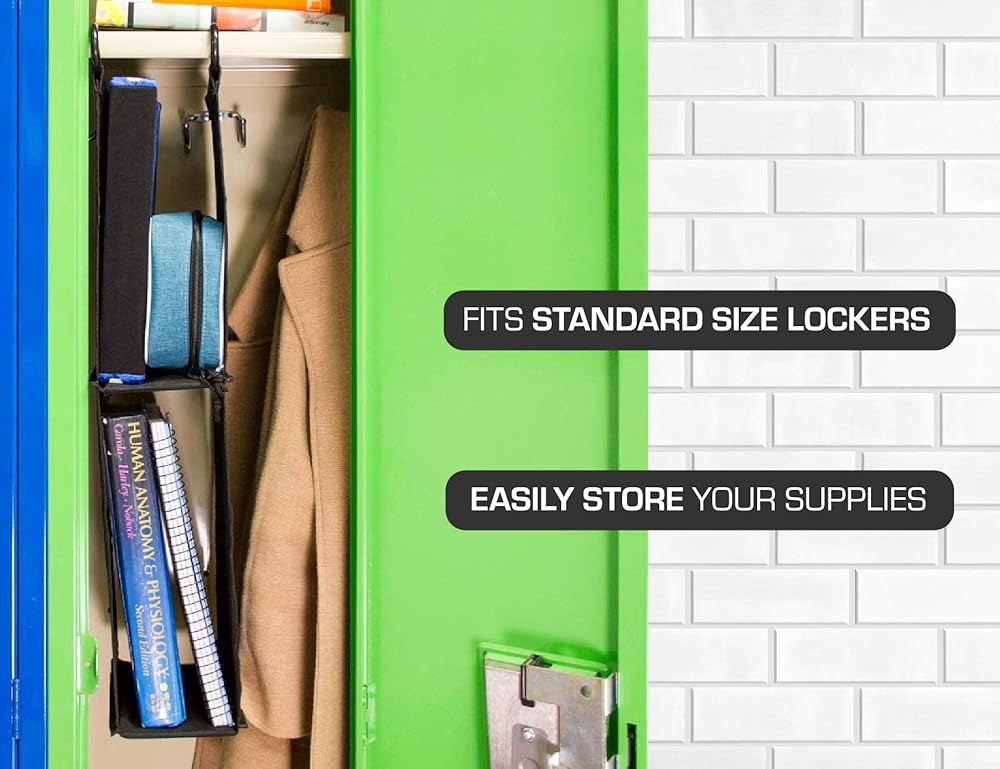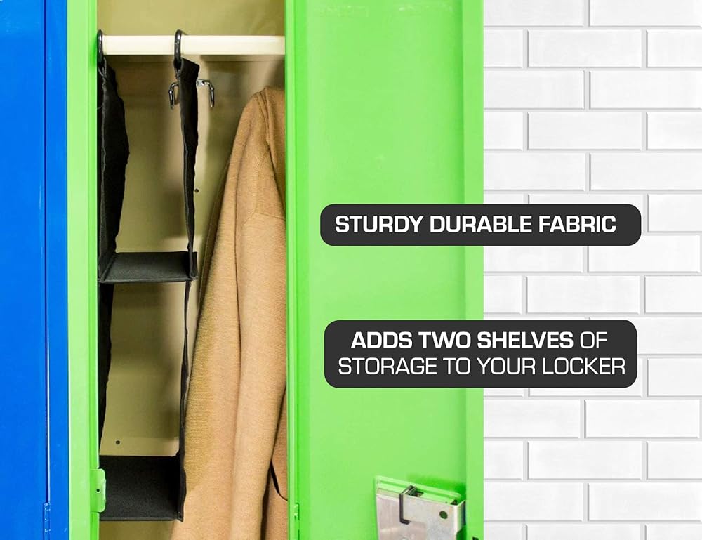 The LockerMate Hanging Fabric Locker Shelf, Black is easy to install and built to last throughout the school year with sturdy, anti-slip hooks that hold the ladder in place. It's the perfect accessory for decoration and function, providing you with extra storage space while maximizing your current locker space. This unique locker accessory adds two shelves and is made of durable fabric that won't wear out. Make the new storage space your own by hanging your favorite jacket, backpack and lunch bag, or by storing your textbooks, notebooks and school essentials. The black hanging locker shelves are guaranteed to invite organization and space in your school locker!