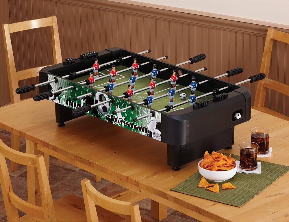 The Mainstreet Classics 36-Inch Table Top Foosball Game creates all the fun of foosball, without taking up nearly as much space and without breaking the bank. Its compact size enables easy storage as well as portability for condensed fun anywhere with a table or flat surface. The table topper has six rows of players, four of which have three players in each row. Each side also has a row with a single goalie foosman. The Mainstreet Classics 36-Inch Table Top Foosball Game includes two "soccer style" foosball balls, two manual sliders for keeping score, and dual-end ball returns. Dimensions: 36-3/4" L x 20" W x 11-3/4" D.