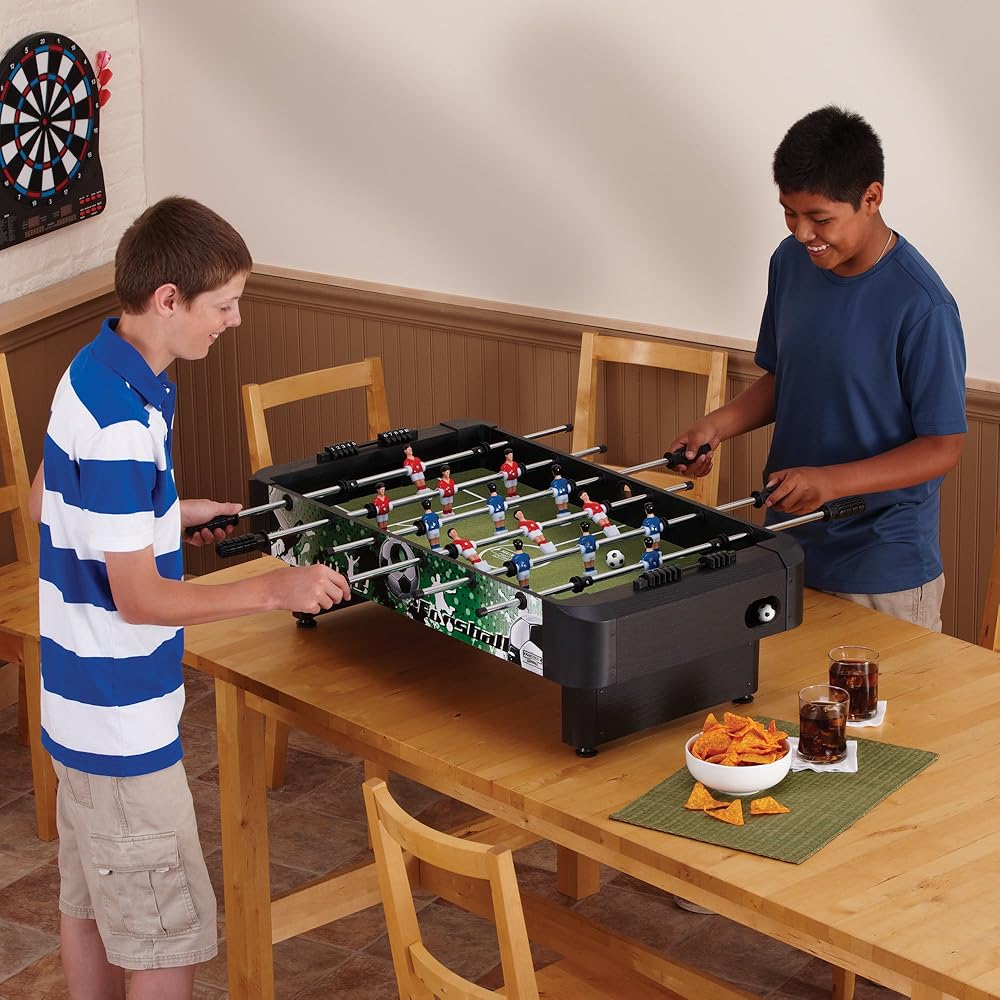 Includes two "soccer-style" foosball balls, two manual sliders for keeping score, and dual-end ball returns