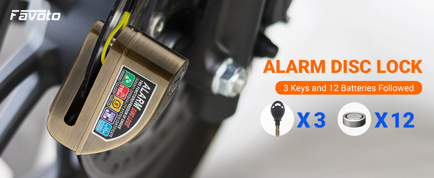 قفل فرامل قرص الدراجة النارية من Favoto، وظيفة إنذار تشغيل/إيقاف ذكية، 3 مفاتيح و12 بطارية (3 سنوات متاحة)، إنذار ضد السرقة مقاوم للماء 120 ديسيبل، دبوس قفل 7 مم - للدراجات النارية والدراجات البخارية والدراجات الإلكترونية