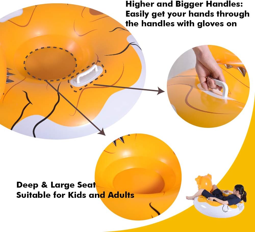Higher and Bigger Handles: Two higher and bigger handles are added to the bulldog inflatable snow tubes for safety. You can easily get your hands through the handles with gloves on. Carrying the tube becomes easy with handles. The deep and large seat of the sled tube is great for kids and adults.