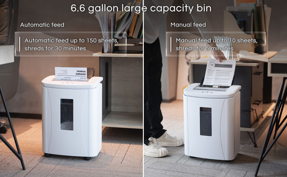 [التقطيع التلقائي 150 ورقة والتمزيق اليدوي 10 أوراق] مع كل من إمكانيات التغذية التلقائية والتمزيق اليدوي، يمكن لآلة تمزيق الورق تمزيق ما يصل إلى 150 ورقة من ورق A4 تلقائيًا، وتمزيق ما يصل إلى 10 ورقات من ورق A4 باستخدام وضع التغذية اليدوية. كما أنها تعمل على تمزيق بطاقات الائتمان والكرتون والدبابيس، فإن آلة تقطيع التغذية التلقائية 2 في 1 هذه تقلل بالتأكيد من وقت العمل وتحسن كفاءة العمل.