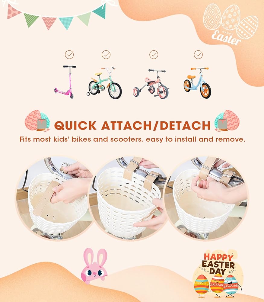 【Easy to Install】This kids bike basket is easy to install and remove, it will not hinder riding, equipped with adjustable leather buckles, it can be detached and installed at will to the front handlebars of children's bicycles that children like or need to use, no need to use tools, even children It can be installed by yourself, and at the same time it can exercise children's hands-on ability. After the installation is completed, children will also feel very proud and have a sense of achievement