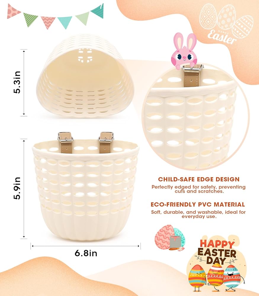 【SIZE:】The children's basket measures 6.8 x 5.3 x 5.9 inches and includes 2 leather buckles for mounting and securing the basket. You can store children's stationery, small toys, cups and other small items in the bike basket, take your kids to the park, beach or home yard to ride and play, easy to free your hands, it will be a great and practical kids bike storage basket.