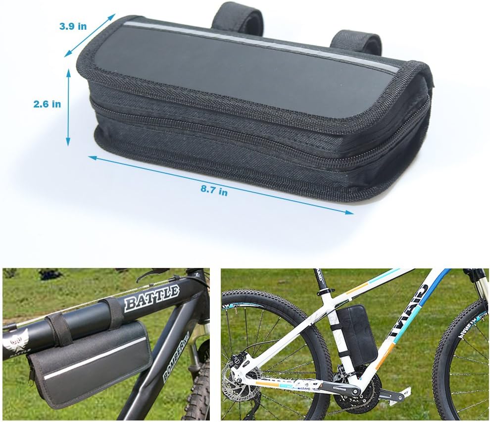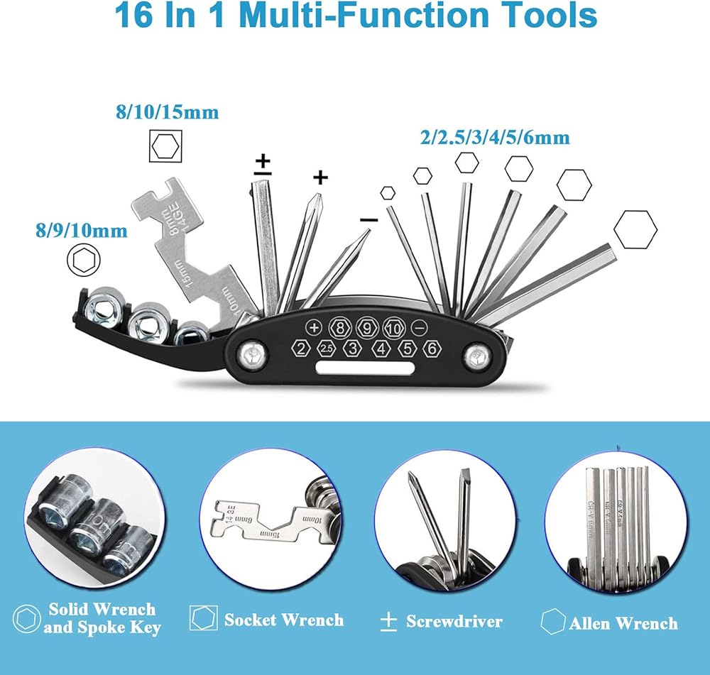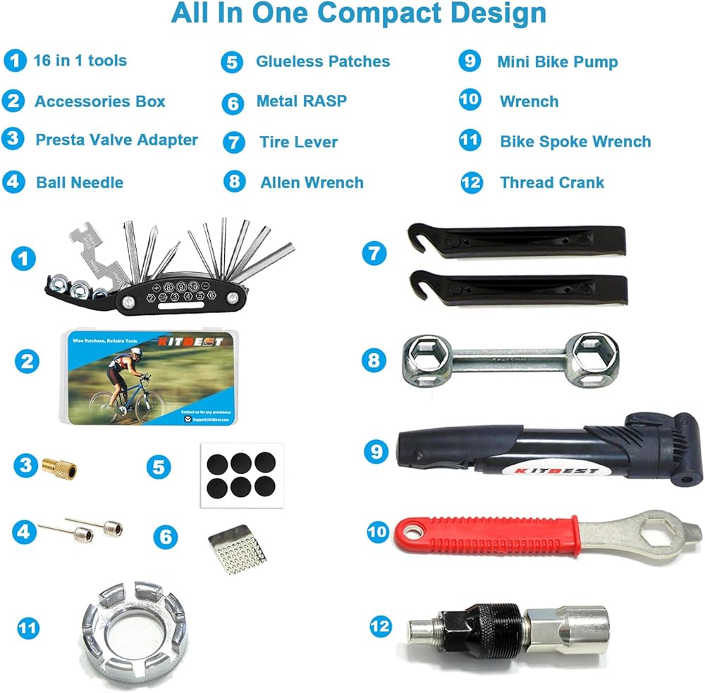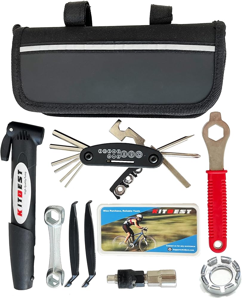 طقم إصلاح الدراجة مع مضخة وحقيبة - مضخة دراجة صغيرة (120 رطل لكل بوصة مربعة) مصنوعة من بولي كلوريد الفينيل عالي الجودة، متينة وخفيفة الوزن، تدعم صمام بريستا وشرايدر. باستخدام الفيلكرو المصنوع من النايلون، يمكنك تثبيت حقيبة الدراجة على إطار الدراجة بإحكام دون فقدانها