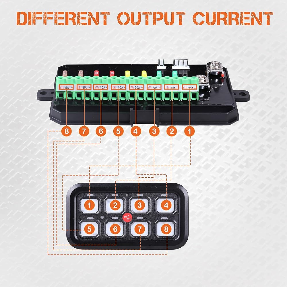 لوحة مفاتيح 8 عصابة - جهد الإدخال: 12 فولت؛ الحد الأقصى لطاقة الإخراج: 600 واط. 24 فولت؛ الحد الأقصى لطاقة الإخراج: 1200 واط، الحد الأقصى لتيار الإدخال: 60 أمبير. درجة حرارة التشغيل: -40 درجة -105 درجة، مقاومة للماء IP65، الحد الأقصى لتيار الإخراج للمجموعة 1 و2 هو 30 أمبير، الحد الأقصى لتيار الإخراج للمجموعة 3-8 هو 20 أمبير. طريقة التوصيل الموصى بها هي خفض التيار تدريجياً من المجموعة 1 إلى المجموعة 8.