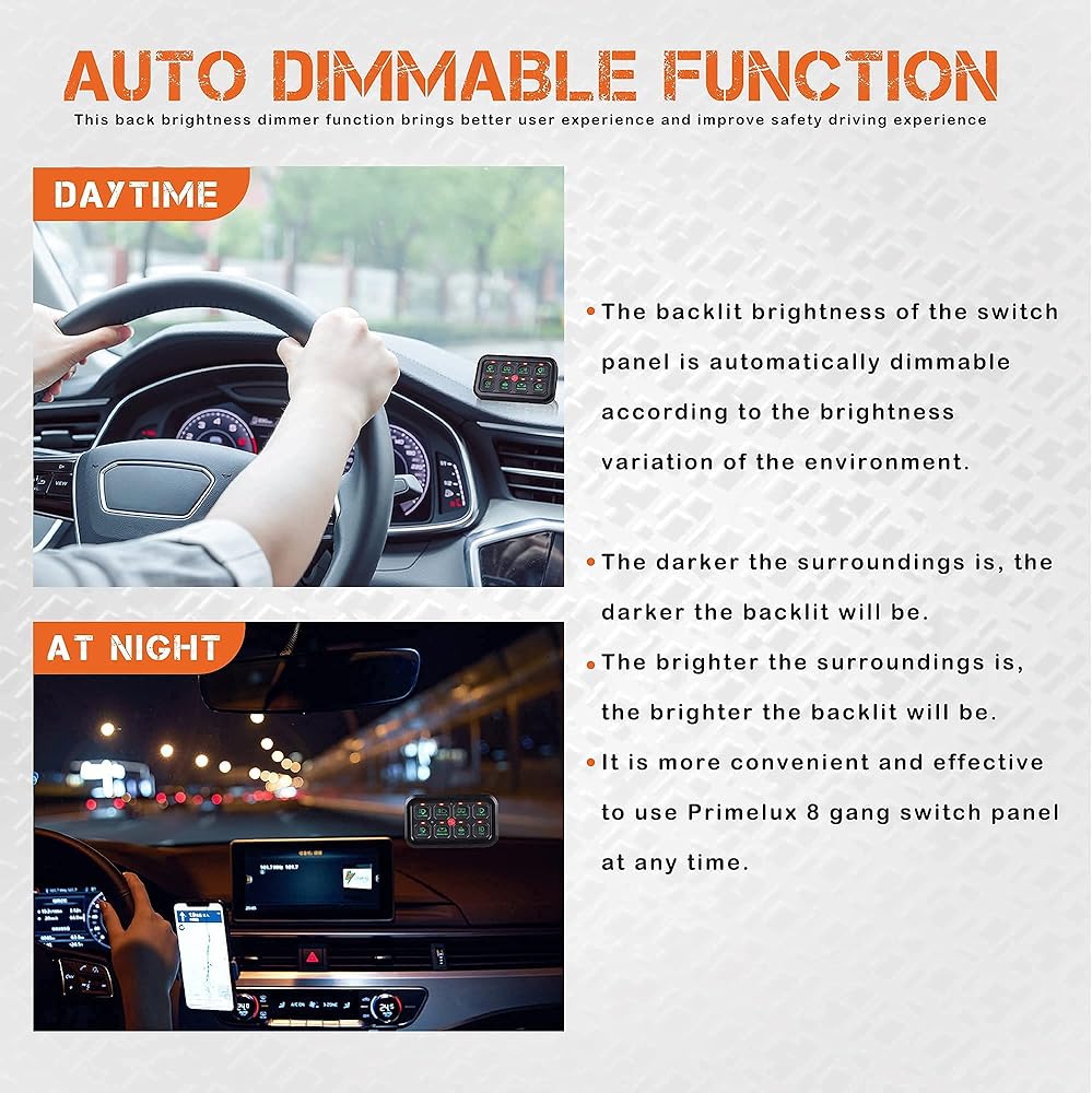 قابل للتعتيم تلقائيًا - يمكن تعتيم سطوع الإضاءة الخلفية للوحة التبديل تلقائيًا وفقًا لتغير سطوع البيئة. كلما كانت المناطق المحيطة أكثر قتامة، كلما كانت الإضاءة الخلفية أكثر قتامة، وكلما كانت المناطق المحيطة أكثر سطوعًا، أصبحت الإضاءة الخلفية أكثر سطوعًا. تصميم التعتيم التلقائي للوحة المفاتيح الصغيرة والمريحة ذات 8 عصابات، يوفر لك تجربة مستخدم مختلفة ويضمن سلامة قيادتك.