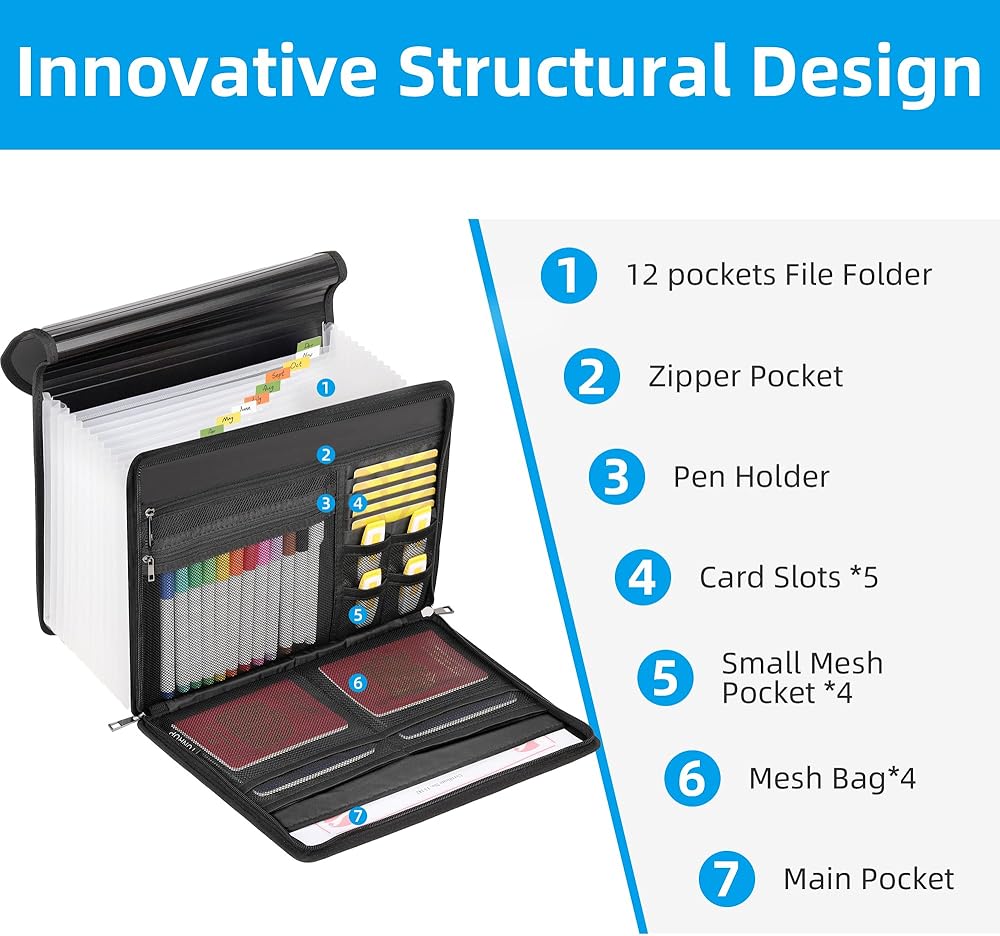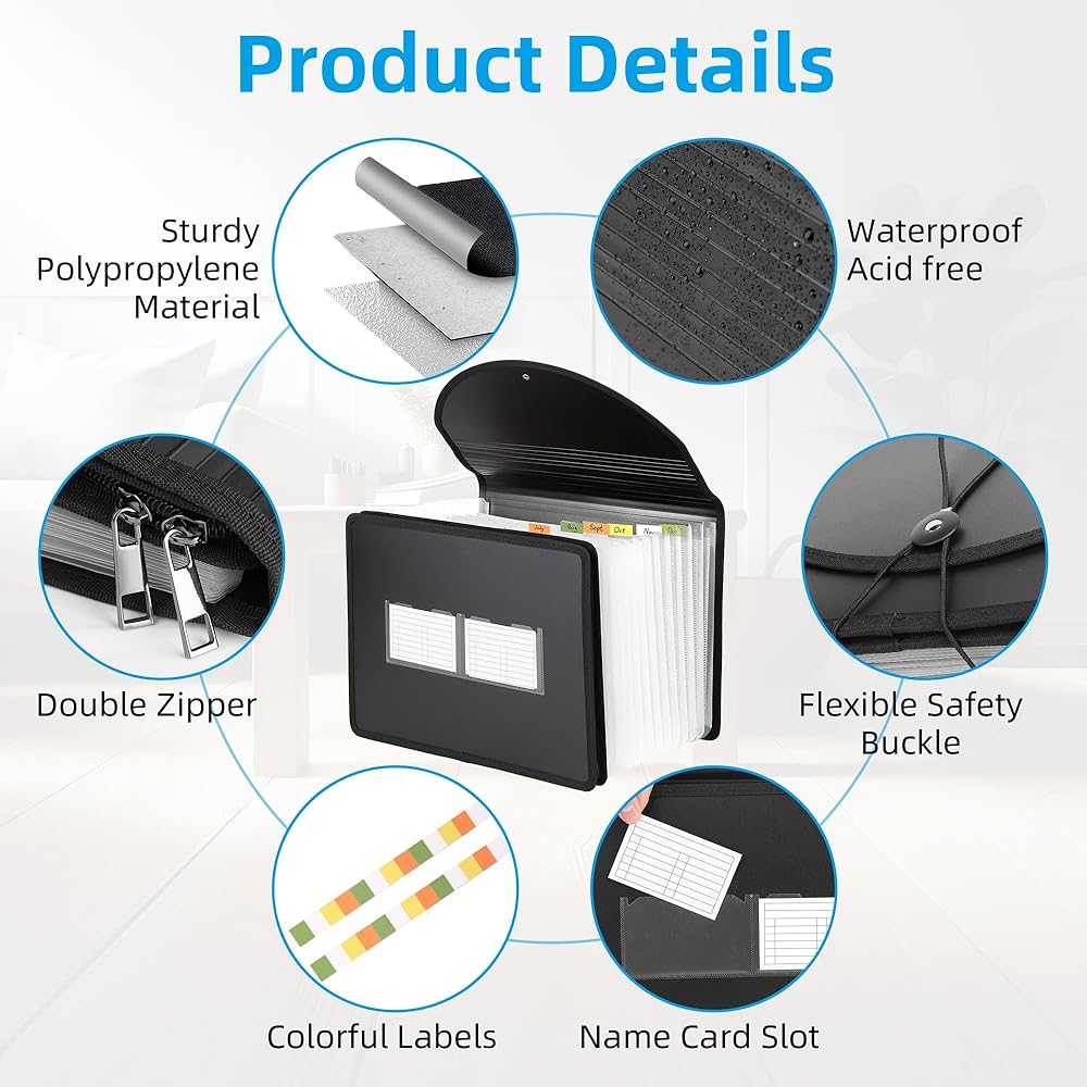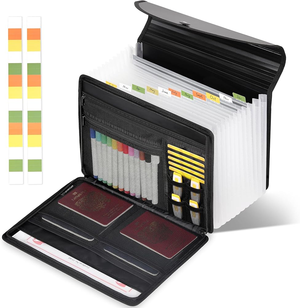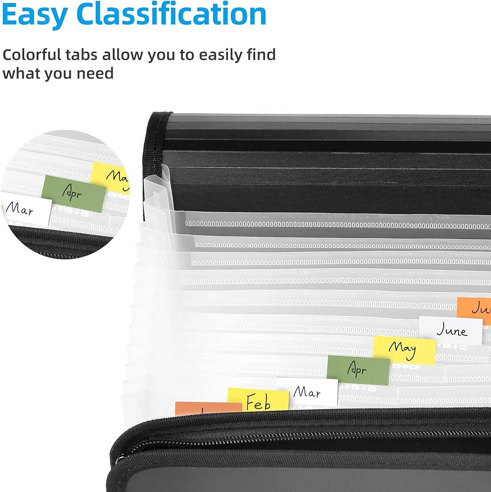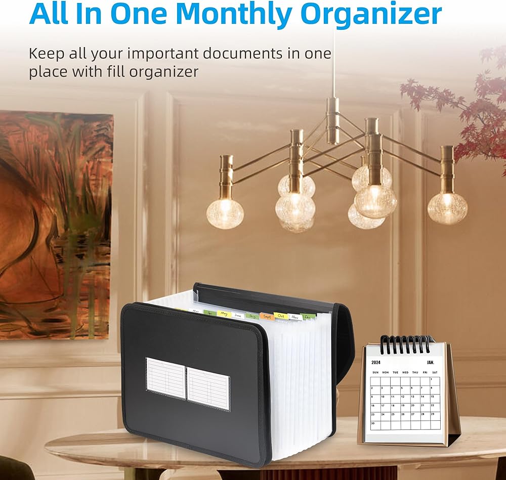 منظم شهري الكل في واحد: منظم ملفات قابل للتوسيع مكون من 12 جيبًا يعمل بشكل رائع لتنظيم وحماية الأعمال الورقية والفواتير وسجلات الهاتف والفواتير والمستندات المتعلقة بالضرائب. مع منظم الملفات الورقية الخاص بنا، يمكنك الآن أن تقول وداعًا للفوضى وتبني نهج أكثر تنظيمًا لإدارة المستندات. سيتم تخزين ملفاتك بشكل آمن ويمكن الوصول إليها بسهولة عند الحاجة. وسيوفر لك منظم المستندات الخاص بنا الراحة وراحة البال