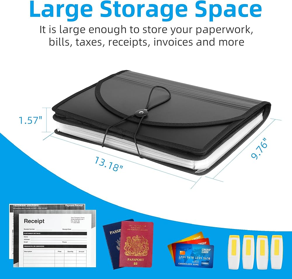 سعة كبيرة: مثل تصميم الأكورديون، يمكن لمنظم الملفات الموسع أن يتوسع حتى 12 بوصة. إنه كبير بما يكفي لتخزين مستنداتك المهمة اليومية مثل الفاتورة والإيصالات والفاتورة والضرائب. كما يحتوي على العديد من الجيوب والفتحات المختلفة لوضع مستندات مختلفة مثل جواز السفر وبطاقة الائتمان وبطاقة SD وشهادات الميلاد وما إلى ذلك. يمكن أن تساعدك في الاحتفاظ بمستنداتك المهمة في مكان واحد. يمكن ضغط منظم الإيصالات على جانب واحد، لذلك لا داعي للقلق بشأن فقدان العناصر الصغيرة