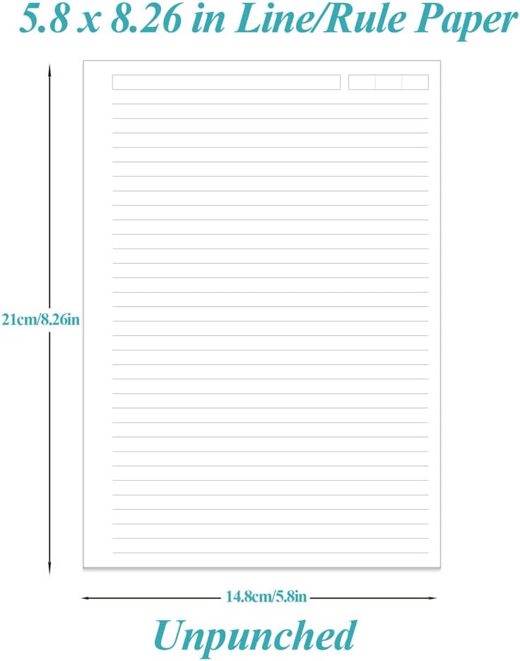 This unpunched lined paper size of 5.8" x 8.25" , 100 sheets/200 pages for 200 days, improve your productivity with this daily organizer. The unpunched loose-leaf filler paper for ring binder, discbound notebook or planner inserts, compatible with Filofax Organizers & Clipbook, Junior Levenger, Levenger Circa, Arc, TUL, Martha Stewart, Talia etc. Refill paper is used to high quality 100gsm pure white premium acid-free paper, so you can confidently use most pens, pencils, and markers without ghosting and bleed-through. This refill line paper for school notes, meeting notes, or any form of writing, our Ruled Sheets have subtle gray lines spaced by a quarter inch.