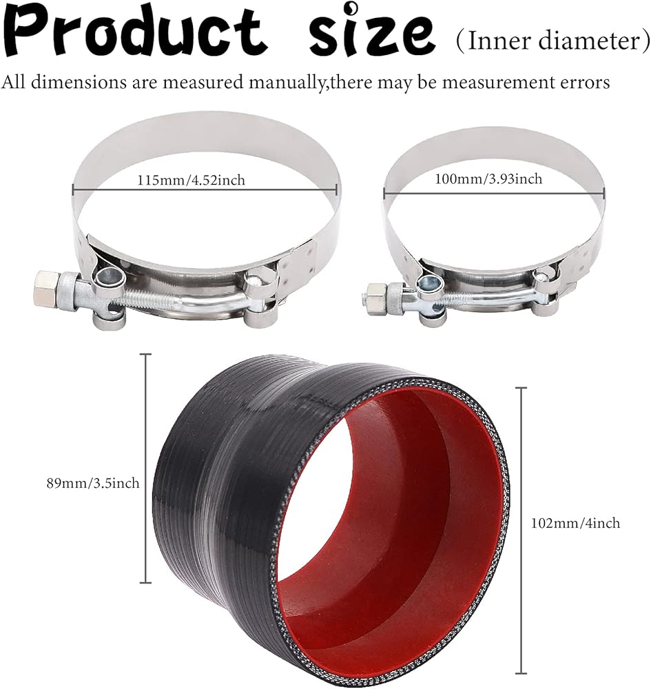 Coupler inner Diameter: 3.5 inch -4 inch (89mm-102mm).Length: 3 inch (76mm).Thickness: 5mm. 2x T-Bolt Clamps(100mm,115mm)