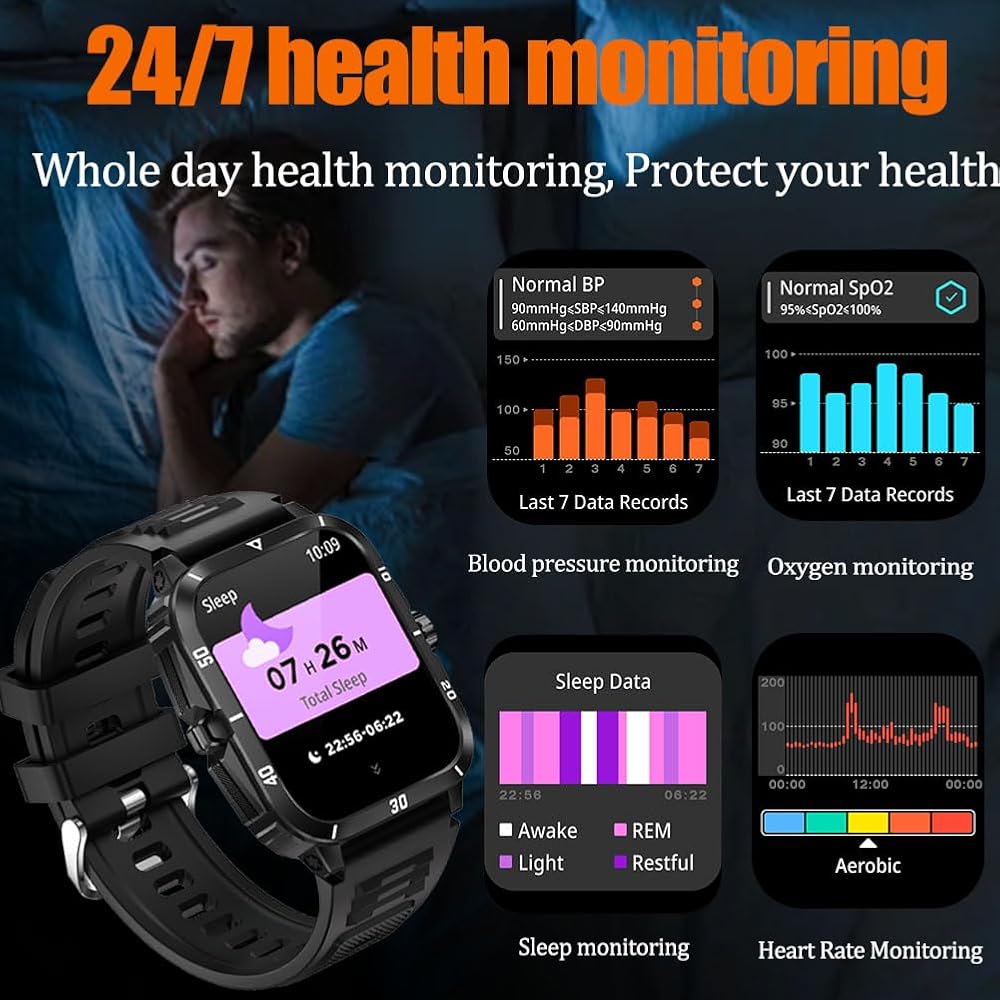 ⌚مساعد الحياة والصحة: تقود هذه الساعة الذكية للرجال العسكريين اتجاه نمط حياة صحي، وهي مجهزة بأحدث أجهزة الاستشعار عالية الدقة، وتكشف بياناتك الصحية بشكل شامل، بما في ذلك معدل ضربات القلب على مدار 24 ساعة، وأكسجين الدم في الوقت الحقيقي، ووقت النوم والجودة. ، بالإضافة إلى توفير تذكيرات للجلوس والشرب لفترات طويلة، مما يساعدك على تطوير نمط الحياة وعادات النوم بشكل أفضل. مراقبة حالتك البدنية بشكل كامل لمساعدتك في الحفاظ على حالة صحية.