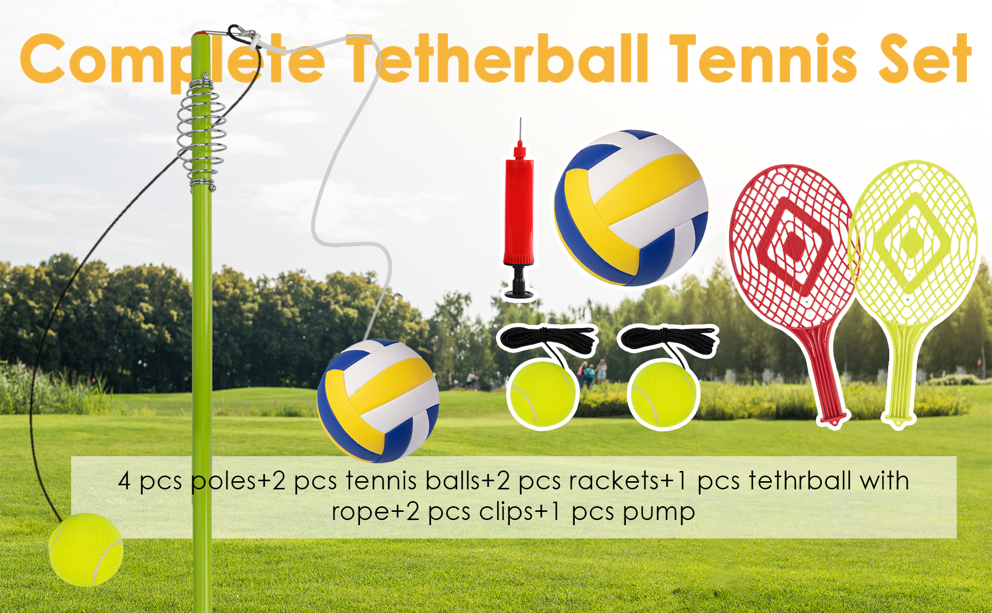 🎾【مجموعة كرة التنس الكاملة】تتضمن عمود ارتفاع قابل للتعديل بطول 6.7 أقدام، قطعتين من كرات التنس، قطعتين من المضارب، قطعة واحدة من كرة الحبل بحبل، قطعة واحدة من الحبل الأبيض، قطعتين من الخطاف، قطعة واحدة من المضخة.