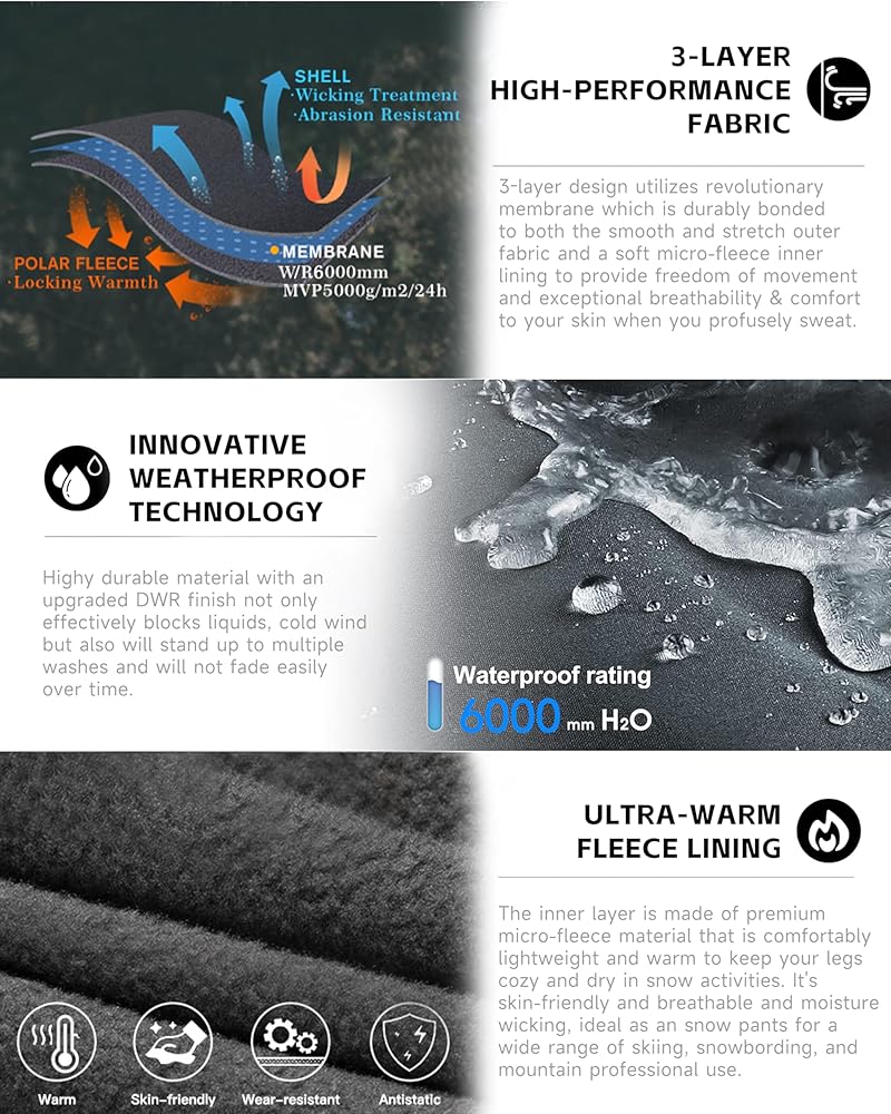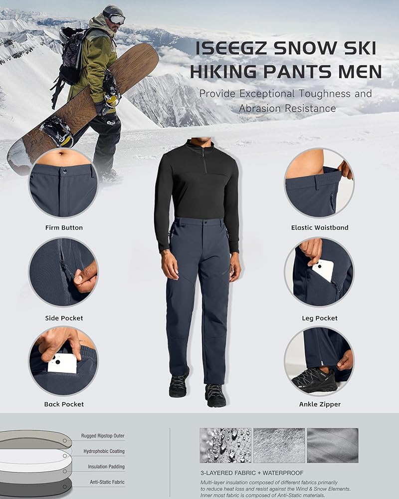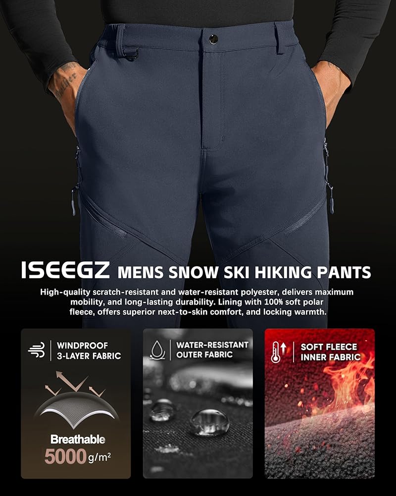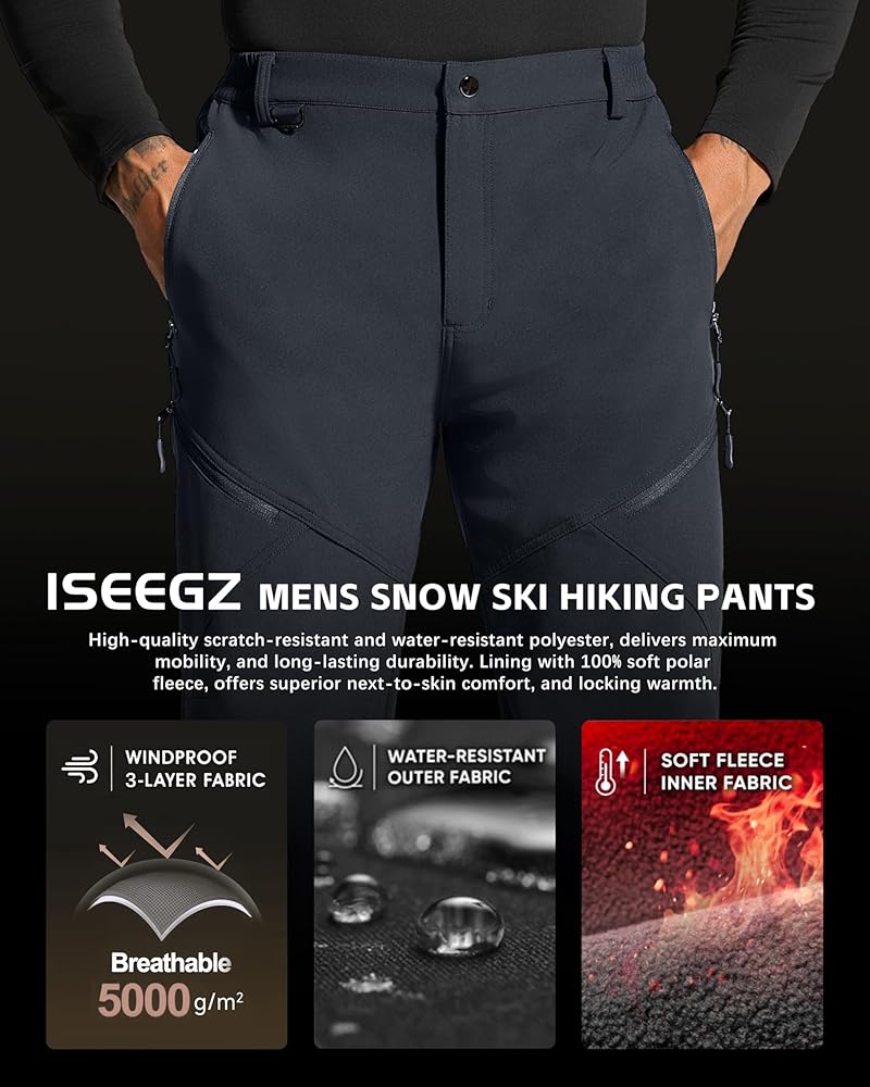 【 النسيج 】 ◀ سراويل ISEEGZ مبطنة بالصوف للرجال الثلج، مصنوعة من بوليستر عالي الجودة مقاوم للخدش ومقاوم للماء، هيكل من ثلاث طبقات من مادة ناعمة قابلة للتمدد، هذا القماش المطاطي في أربعة اتجاهات، والنسيج المقاوم للتآكل يوفر أقصى قدر من الحركة، وطويل الأمد متانة دائمة. سراويل التزلج الجبلية المعزولة للرجال، مبطنة بالصوف القطبي الناعم بنسبة 100%، توفر راحة فائقة على الجلد ودفء ثابت.