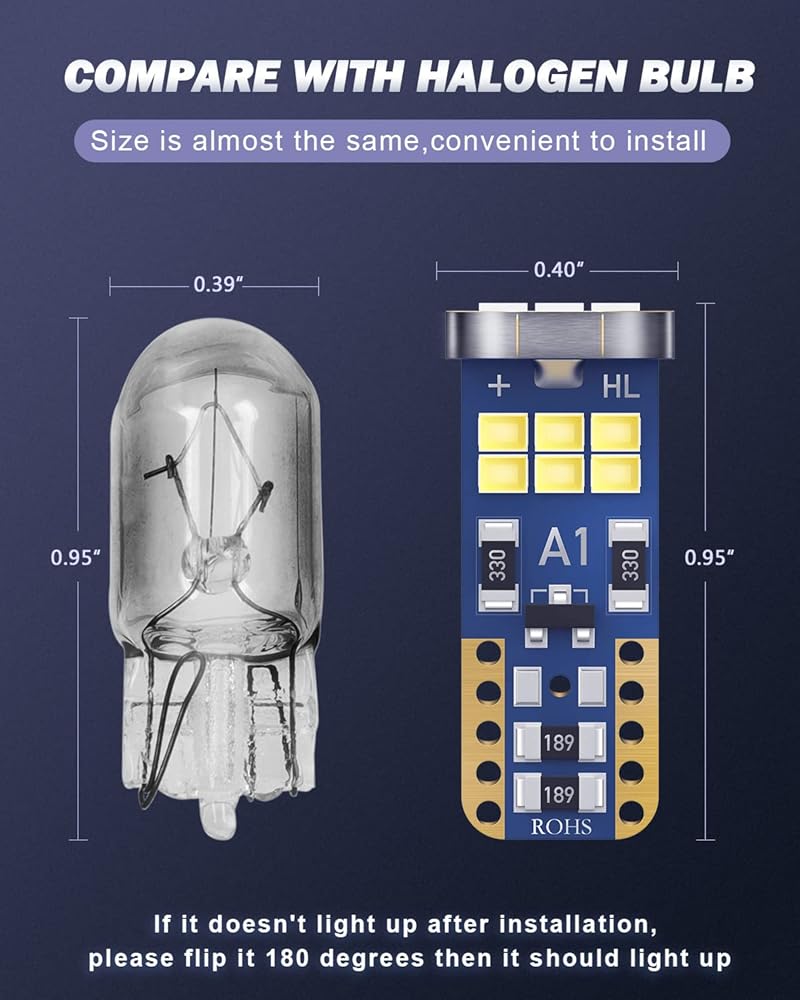 سهولة التركيب: من السهل تركيب لمبة LED 168، فقط قم بالتوصيل والتشغيل! إذا لم يضيء، فيرجى قلبه 180 درجة ثم يجب أن يضيء. الى جانب ذلك، إذا كان لديك أي مشكلة، يرجى الاتصال بنا في أي وقت.